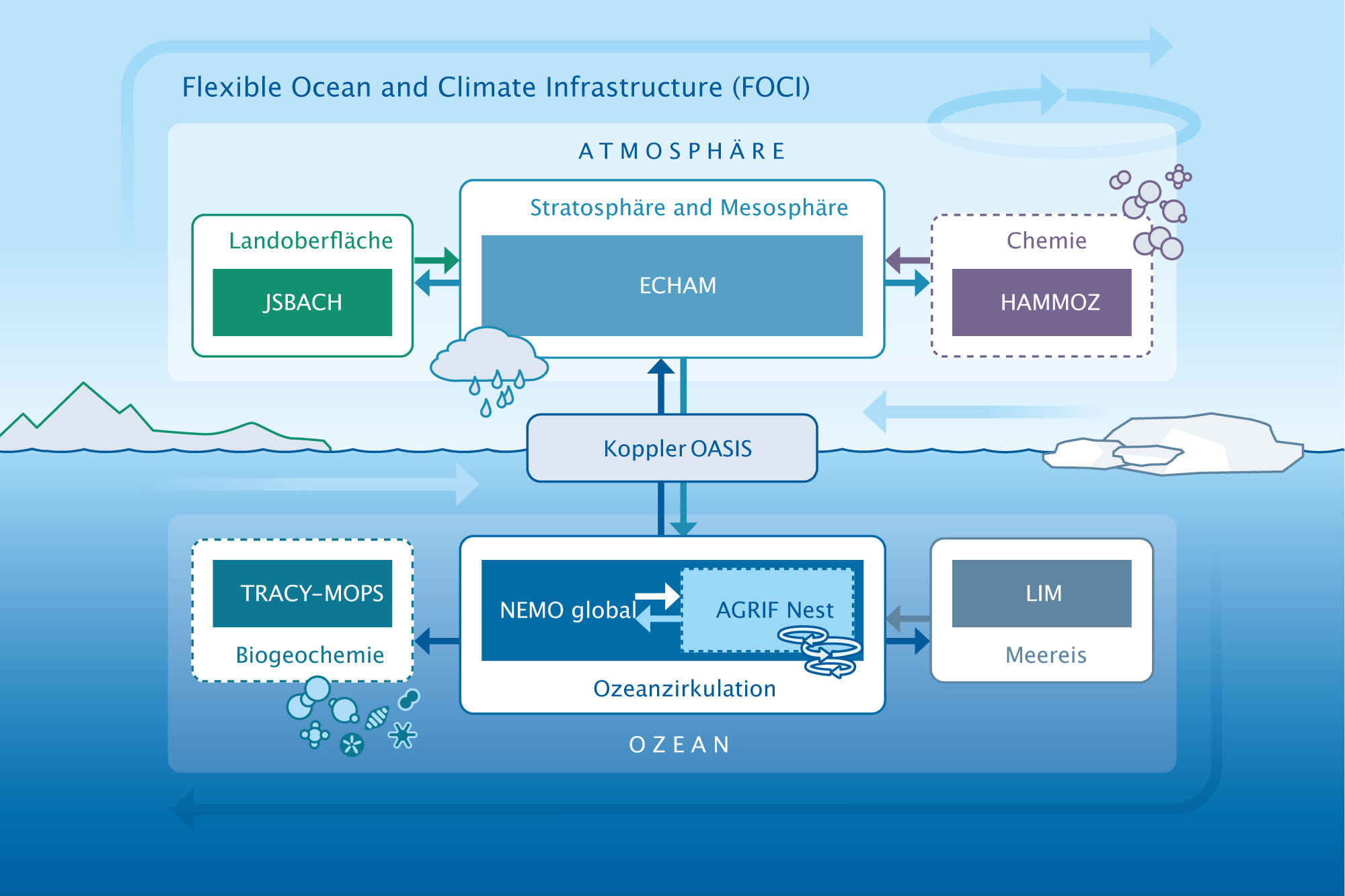 Klimaforscher müssen in der Nachbildung der realen Welt immer Kompromisse eingehen. Auch mit den größten weltweit verfügbaren Computern können sie diese nur näherungsweise nachbilden. Je nach Anwendung müssen Vereinfachungen in der räumlichen Auslösung, aber beispielsweise auch in den physikalischen Prozessen eingegangen werden. Während man Untersuchungen über Zeiträume von Monaten bis zu wenigen Jahren oft noch mit hoher räumlicher Auflösung realisieren kann, können bei Integrationen über Jahrhunderte bis Jahrtausende nur gröber auflösende Modelle verwendet werden. In der Vergangenheit wurden Modelle speziell für den jeweiligen Zweck entwickelt. Am GEOMAR Helmholtz-Zentrum für Ozeanforschung Kiel wurde jetzt ein flexibler Modellbaukasten, genannt FOCI (Flexible Ocean and Climate Infrastructure), vorgestellt, der auf dem Erdsystemmodell des Max-Planck-Institutes für Meteorologie in Hamburg basiert und insbesondere im Ozean mit dem NEMO-Ozeanmodell modifiziert wurde, um regional mit höheren Auflösungen auch kleinräumige Prozesse darzustellen.