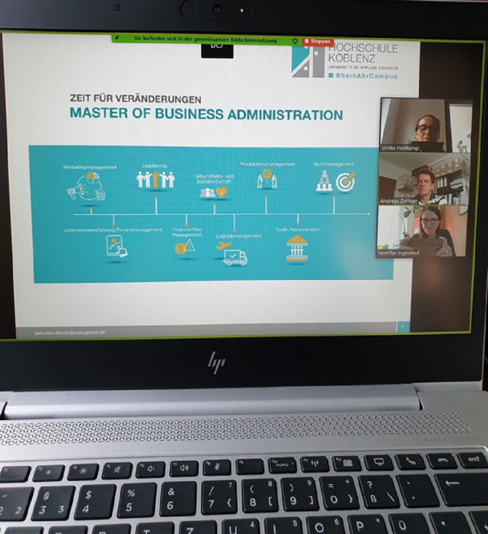 In Zeiten, in denen persönliche Treffen nicht möglich sind, lädt der RheinAhrCampus alle Interessierten zu einer virtuellen MBA-Informationsveranstaltung ein: Am Dienstag, den 30. Juni von 18:00 bis 19:30 Uhr stellt das MBA-Team die Studieninhalte, den Ablauf und die Organisation des Fernstudiums ausführlich vor – wer teilnehmen möchte, schließt sich einfach der Zoom-Videokonferenz an. Die Teilnehmenden haben dabei Gelegenheit über die Chat-Funktion individuelle Fragen zu stellen, die das MBA-Beratungsteam im Anschluss an die ca. 30-minütige Präsentation beantwortet.