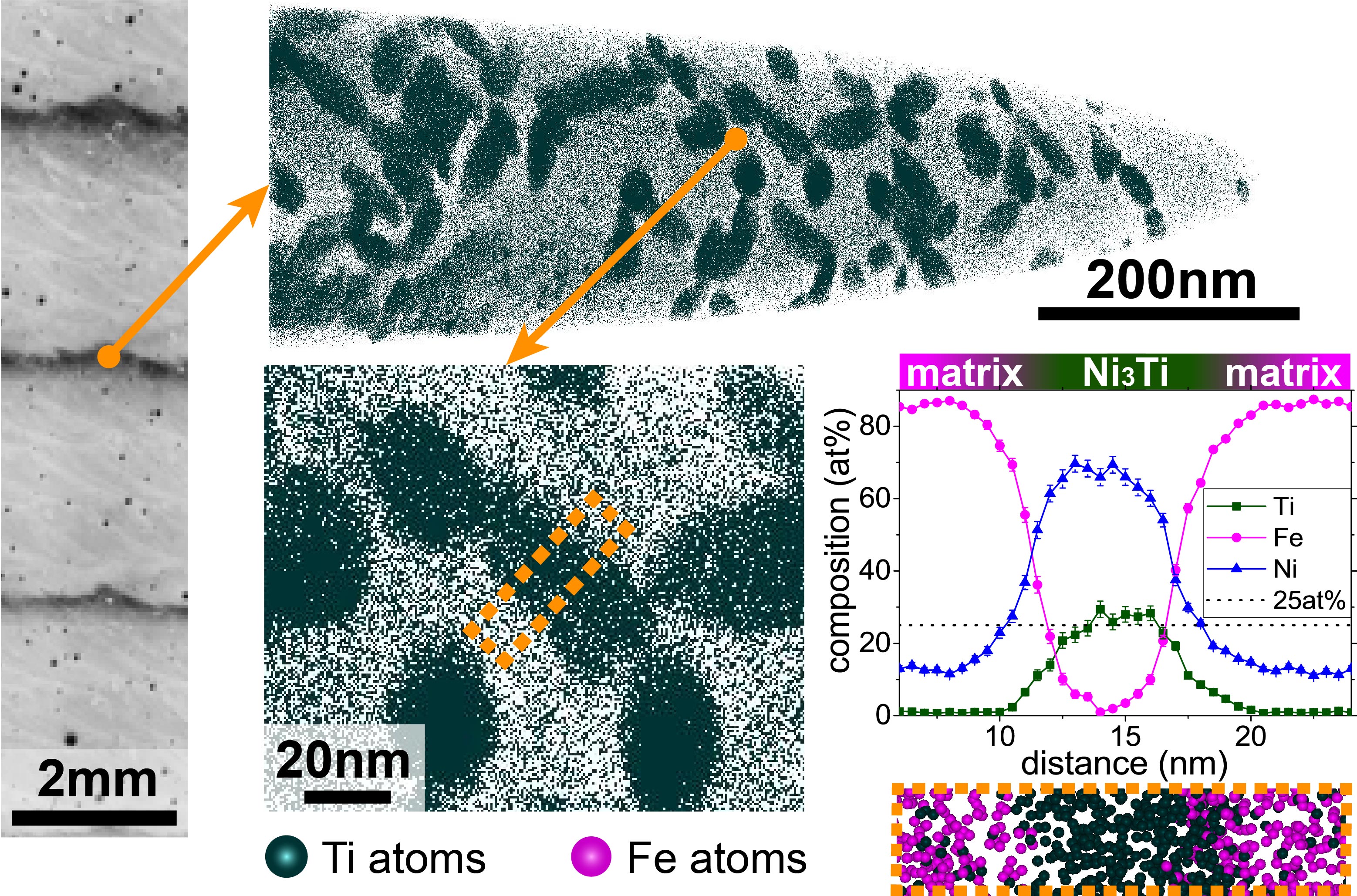 “We designed a new iron, nickel and titanium based steel that is tailor-made for additive manufacturing processes. This new steel is capable of exploiting advantages of directed energy deposition, such as the intrinsic heat treatment capability. By controlling the temperature and cooling rates, we were able to digitally control the alloys’ microstructure layer by layer and gained a maraging steel with adjustable properties”, explains Kürnsteiner, postdoctoral researcher in the groups “Alloys for Additive Manufacturing” (AAM) and “Atom Probe Tomography” and first author of the ‘Nature’ publication. Directed energy deposition is one of the most popular additive manufacturing techniques. Samples are built from computer models in a fully digitalized manner by melting metallic powder with a focused laser beam. The layer by layer construction, typical for additive manufacturing processes, gave the chance to mimic the structure of Damascus steels. Damascus steels gain their high strength and ductility through a structure of soft and hard layers, which is achieved through repeated folding and forging. “Instead of folding and forging, we used the digital control over the process parameters. We exploited the complex thermal history of additive manufacturing, including cyclic re-heating to trigger the phase transformations needed for high strength and ductility: first, a formation of a nickel rich martensite microstructure transformed from austenite. Second, the formation of nickel-titanium precipitates, which leads to a hardening effect.”, explains Jägle, head of the AAM group and since January 2020 also professor at the Universität der Bundeswehr München. The scientists gained control over the cooling-down of the sample via specific pause times that were introduced during the additive manufacturing process. This allowed to control the sequence of the two phase transformations and hence alternate between hardened and non-hardened regions. In order to study the complex and highly hierarchical microstructure of additively manufactured steels, a combination of different analytical techniques including electron backscatter diffraction and atom probe tomography was used. This allowed to draw a complete picture of the microstructure ranging from hardened layers occurring on a millimetre length scale to solidification structures on a micrometre scale down to nanometre sized nickel-titanium precipitates that were triggered by the intrinsic heat treatment.