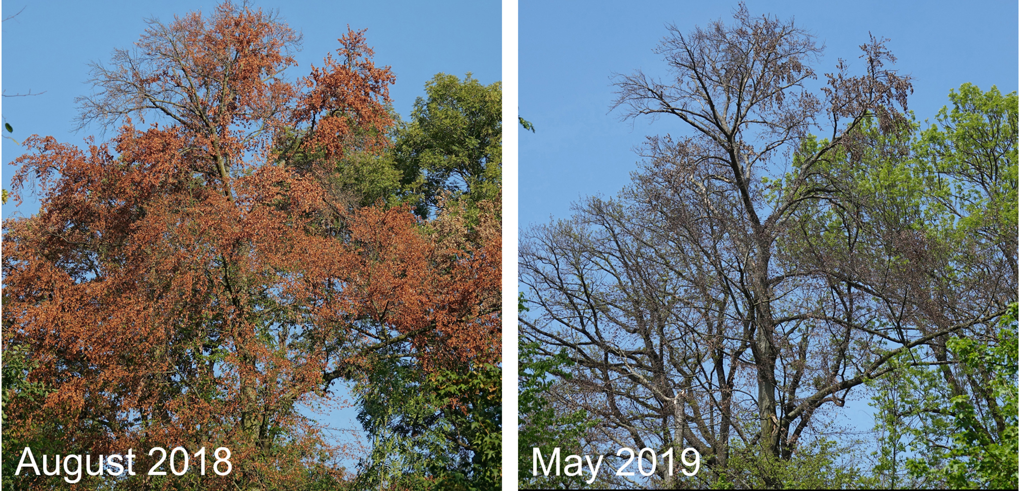 Moreover, unexpectedly strong drought-legacy effects were detected in 2019: many broad-leaved trees did not unfold their leaves – they had died. Others that survived the 2018 event where not able to withstand the following drought in 2019, or became increasingly susceptible to infestation with bark beetles or fungi.