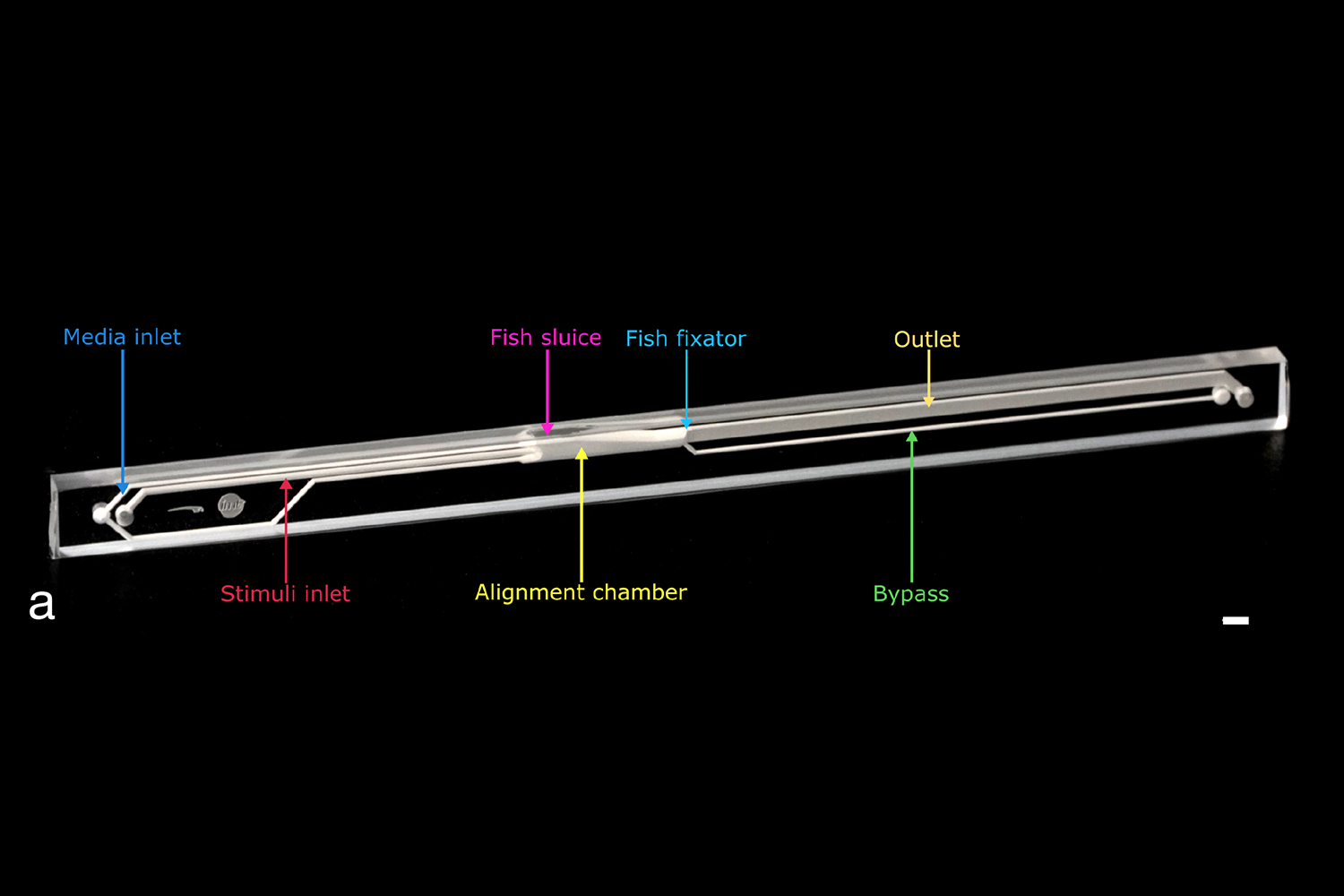 Um die Gehirne von Zebrafischen besser untersuchen und verstehen zu können, entwickelten Dr. Kai Mattern und Professor Andreas Dietzel vom Institut für Mikrotechnik (IMT) eine winzige Parkgarage mit einer Gegenstromanlage. Hier können die Tiere kurzzeitig in Wasser festgehalten werden. Das Besondere an dieser Kammer ist, dass sie vollständig aus optisch hochwertigem Glas besteht. Dieses haben die Wissenschaftler Schicht für Schicht mit einem Ultrakurzpulslaser abgetragen und dabei als „Mikro-Bildhauer“ nicht nur Kammern, sondern auch winzige Strömungskanäle in das Innere des Glases eingraviert. Diese Strömungskanäle, durch die Wasser fließt, halten die Fische in Position und können zugleich Strömungs-Stimuli geben.