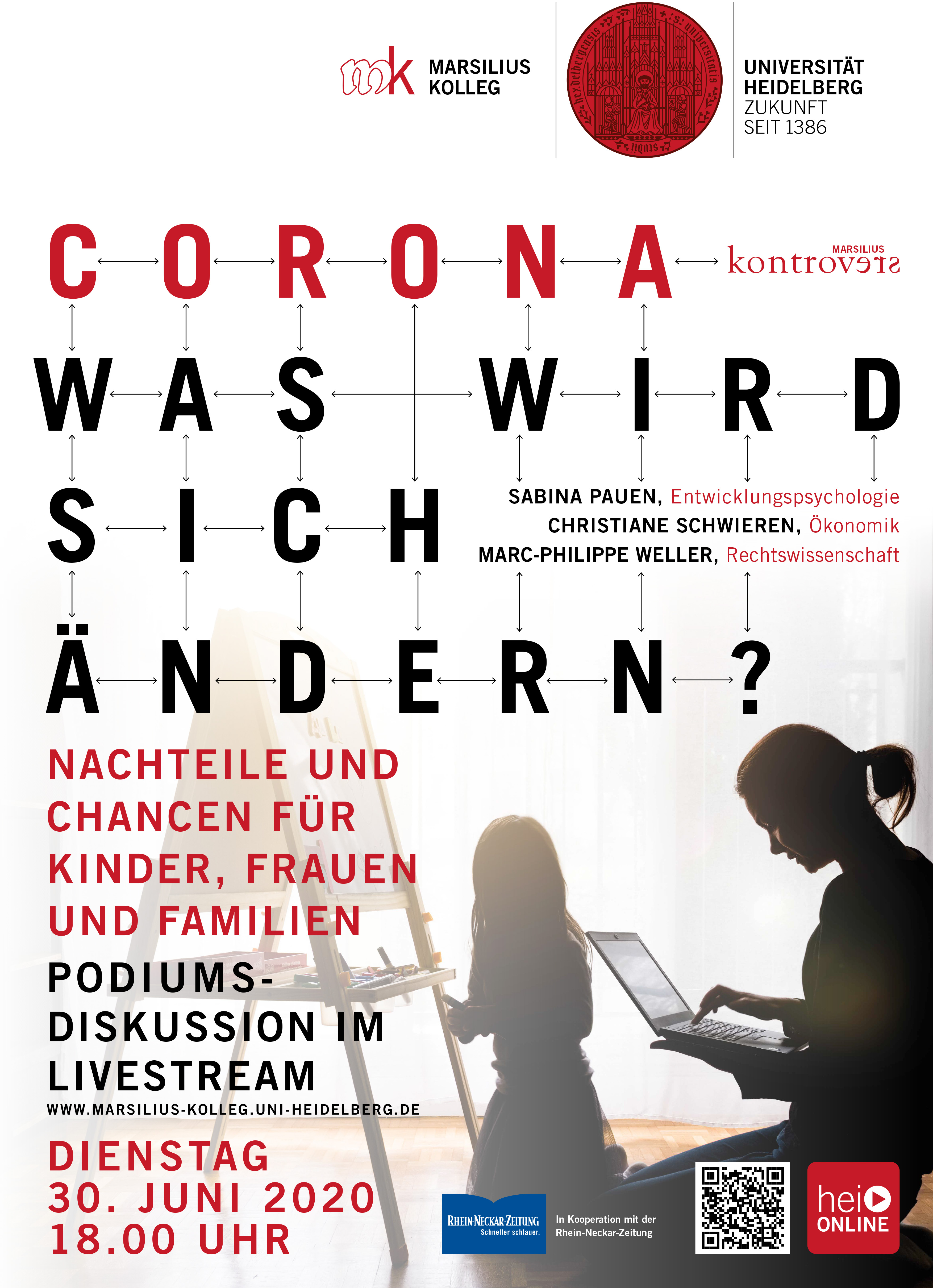 Homeoffice und Homeschooling, der Ausfall von Kinderbetreuung und Freizeitangeboten: Werden Kinder in ihren Entwicklungsmöglichkeiten derzeit beeinträchtigt? Und führt die aktuelle Situation zu einem Rückschritt für die Gleichstellung? Über gesellschaftspolitische Auswirkungen der Corona-Pandemie sowie mögliche Strategien für eine gerechtere Lastenverteilung diskutieren die Entwicklungspsychologin Prof. Dr. Sabina Pauen, die Ökonomin Prof. Dr. Christiane Schwieren sowie der Rechtswissenschaftler Prof. Dr. Marc-Philippe Weller. Die Veranstaltung „Corona – Nachteile und Chancen für Kinder, Frauen und Familien“ ist Teil der Reihe „Marsilius kontrovers“, zu der das Marsilius-Kolleg der Ruperto Carola in Kooperation mit der Rhein-Neckar-Zeitung einlädt. Sie wird am Dienstag, 30. Juni 2020, ab 18 Uhr im Livestream online übertragen – auch erreichbar über heiONLINE, das zentrale Portal der Universität Heidelberg mit Vorträgen, Diskussionsrunden und Podcasts in digitalen Formaten.