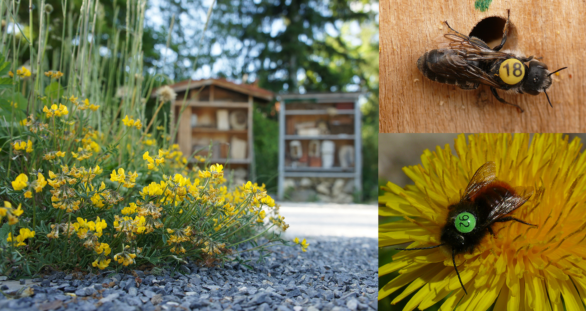 In der aktuellen Studie markierten die Forscherinnen und Forscher Wildbienen direkt an ihrem Nest, und zwar so, dass sie in ihrem natürlichen Sammelverhalten nicht beeinträchtigt werden. Nur so kann man sehen, in welcher Entfernung vom Nest Bienen natürlicherweise Pollen sammeln. Die Markierungsversuche wurden von Studenten und Wissenschaftlern der Ludwig-Maximilians-Universität München und der Botanischen Staatssammlung München (SNSB-BSM) durchgeführt: im Botanischen Garten München-Nymphenburg wurden in den Jahren 2017 und 2018 an zwei großen Insektennisthilfen Wildbienen individuell markiert, um diese dann im Botanischen Garten auf den Blüten wiederzufinden. Unter der wissenschaftlichen Leitung von Prof. Susanne Renner vom Institut für Systematische Botanik der LMU und Botaniker und Wildbienenkenner Dr. Andreas Fleischmann von der Botanischen Staatssammlung München wurden von Doktorandin Michaela Hofmann zusammen mit Bachelor-Studenten der LMU in den beiden Jahren insgesamt 2689 Wildbienen-Individuen markiert. Dazu wurde jedem Tier mit ungiftigem Schelllackkleber ein farbiges, nummeriertes Plastikplättchen auf ihren Rücken geklebt. Mit dieser Methode markieren Imker normalerweise ihre Bienenkönigin. Kleinere Wildbienenarten wurden mit individuellen Farbcodes aus ungiftigem Farblack auf ihrem Rücken markiert. Es wurden sechs Wildbienen-Arten untersucht – größere und kleinere, solche die im Frühjahr fliegen und typische Sommerarten, Arten mit breitem Nahrungsspektrum und Nahrungsspezialisten, die Pollen für ihre Larven nur an einer einzigen oder ganz wenigen Pflanzen sammeln (sogenannte oligolektische Arten). Die markierten Bienen wurden dann während ihrer Flugperiode täglich im Garten an möglichen Futterquellen gesucht. Darüber hinaus konnten auch Besucher des Botanischen Gartens beobachtete markierte Wildbienen melden und mit einem (Handy)Foto dokumentieren – die Daten aus diesem von den Besuchern sehr gut angenommen Citizen-Science-Projekt flossen ebenfalls in die Studie mit ein, insgesamt gab es 203 Rückmeldungen von gesichteten markierten Wildbienen durch Gartenbesucher.
