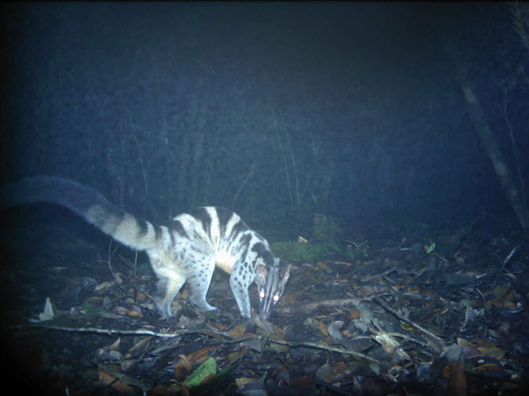 Neben dem Riesenmuntjak wurde mit den Kamerafallen auch eine weitere auf das Annamiten-Gebirge beschränkte endemische Art erfasst: der Fleckenroller (Chrotogale owstoni). Dieses auffallend gemusterte kleine Raubtier steht infolge der weit verbreiteten Wilderei zur Versorgung des Buschfleischhandels in Vietnam kurz vor der Ausrottung. „Wir haben bisher die Hälfte des Gebietes untersucht und bereits sieben Aufnahmen dieser Art gesammelt. Der Bidoup Nui Ba NP ist eines der wenigen Schutzgebiete in Vietnam, in dem so viele Aufzeichnungen des Fleckenrollers bisher gelungen sind", erklärt An Nguyen, Projektkoordinator und Doktorand am Leibniz-IZW. „Unsere Daten deuten darauf hin, dass innerhalb des Nationalparks wahrscheinlich eine gesunde Population lebt."