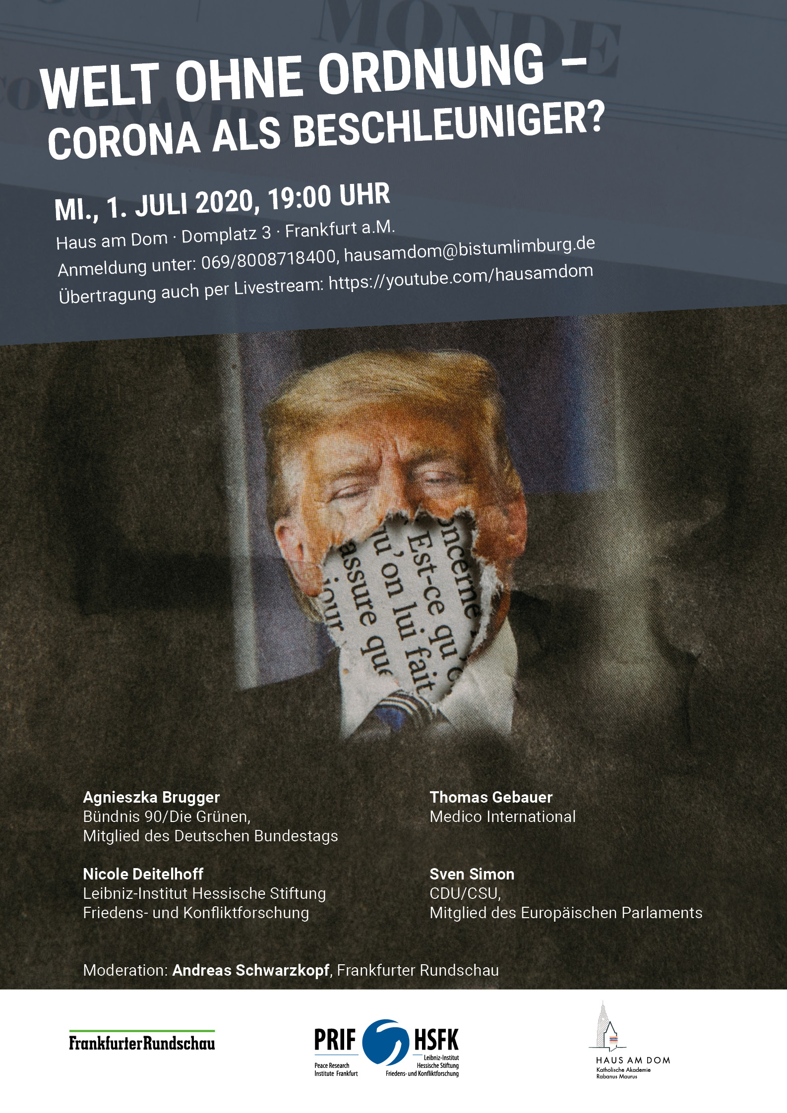 Podiumsdiskussion am Mittwoch, den 1.7.2020 im Haus am Dom in Frankfurt am Main mit Online-Übertragung. Es diskutieren: Agnieszka Brugger, Nicole Deitelhoff, Thomas Gebauer und Sven Simon. Moderation Andreas Schwarzkopf, Frankfurter Rundschau.