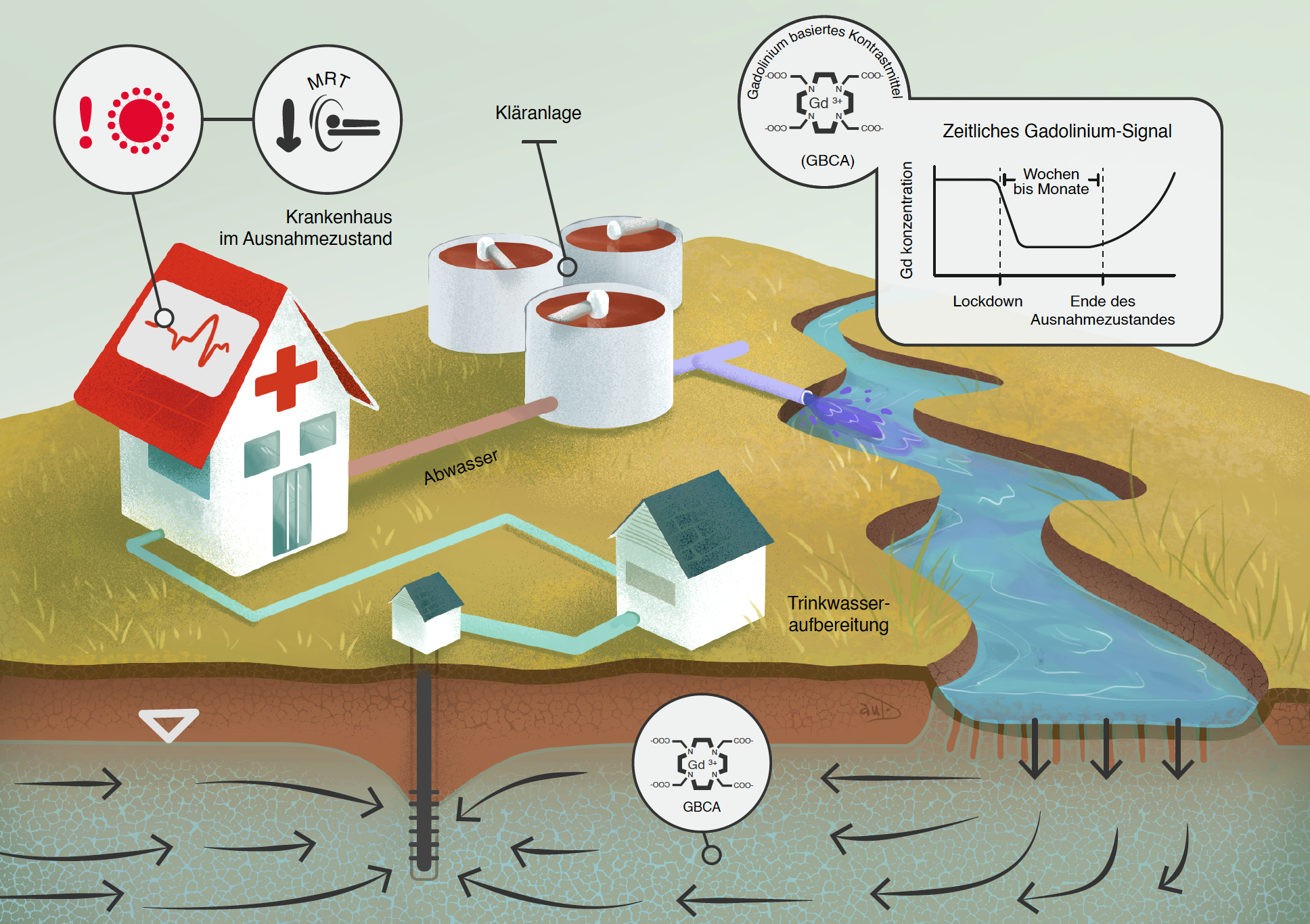 In den meisten Ländern wird Trinkwasser aus aufbereitetem Flusswasser oder Uferfiltrat gewonnen, auch kleinere Teile Wiens werden so versorgt. Da Gadolinium-Verbindungen aus Kontrastmitteln bei MRT-Untersuchungen weder technisch noch chemisch in Kläranlagen aufgefangen werden können, gelangen sie ins Abwasser und damit ins Trinkwasser. Wird das Gadolinium enthaltene MRT-Kontrastmittel im Trinkwasser nachgewiesen gibt das auch Hinweise darauf, wie hoch der Anteil an geklärtem Abwasser im Trinkwasser ist.