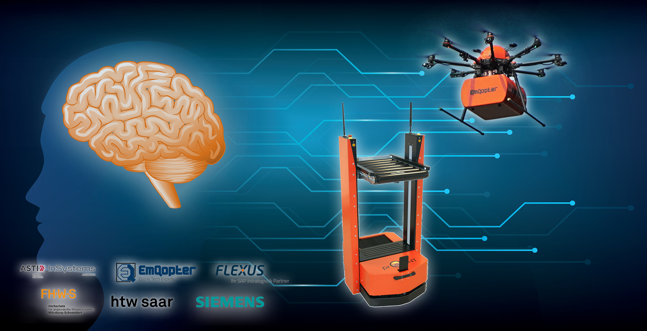 In Kooperation werden verschiedene Transporteinheiten wie fahrerlose Transportsysteme (FTS) und Multicopter-Drohnen weiterentwickelt, um in unterschiedlichen Netzwerken einzelne, technologische Systemgrenzen zu überwinden.