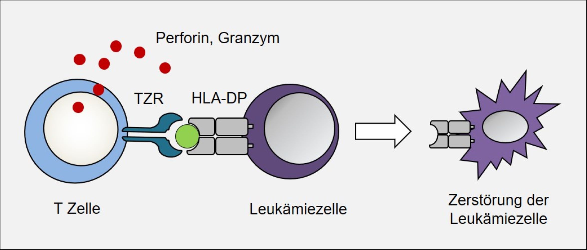T-Zellen können mit Hilfe ihres T-Zell-Rezeptors (TZR) fremde Eiweißbausteine (hier HLA-DP) auf Leukämiezellen erkennen und durch die Freisetzung von Abwehrstoffen die Leukämiezelle zerstören.