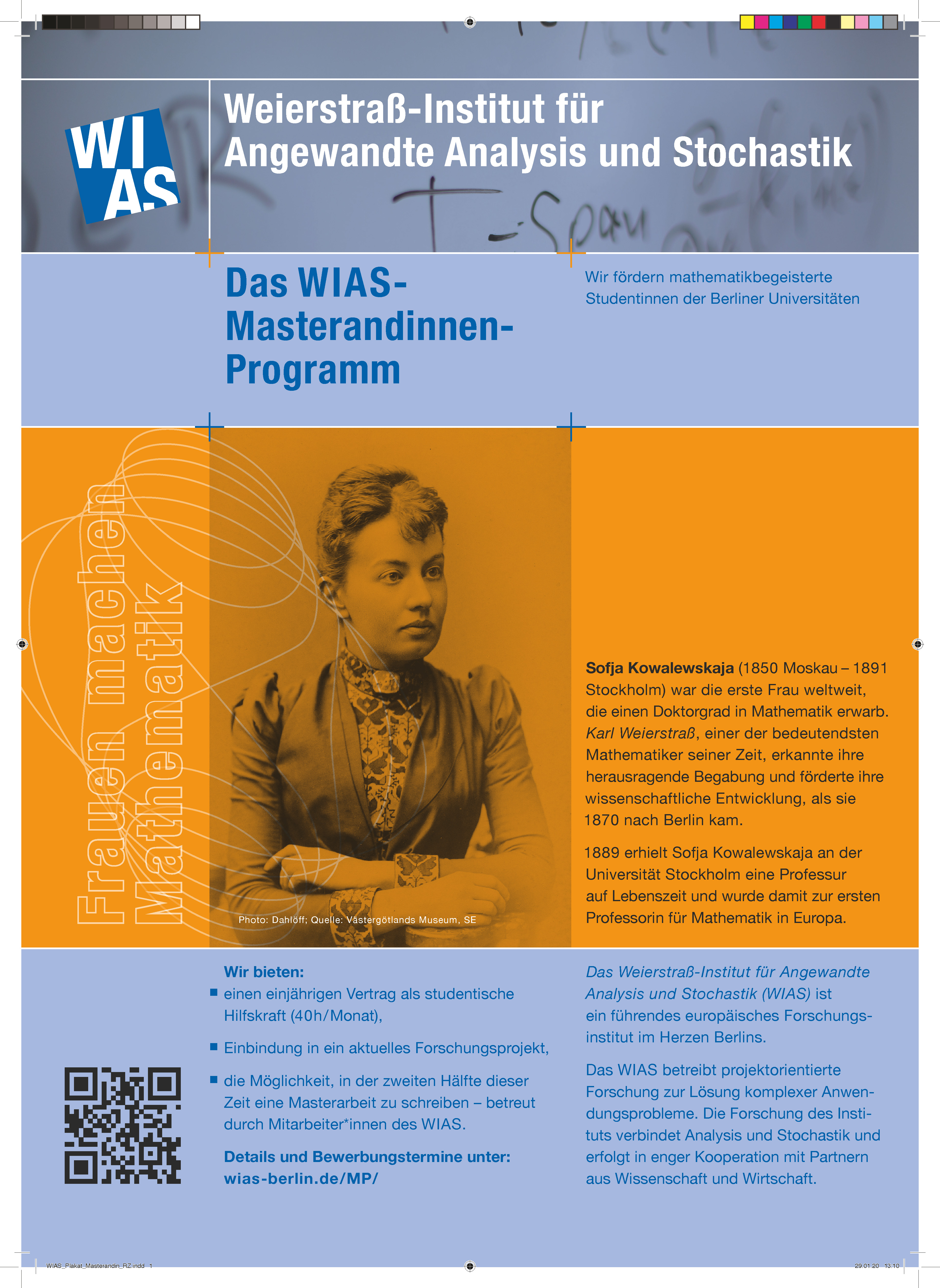 Im Mai startete am WIAS ein Masterandinnen-Programm. Darin werden Studentinnen als wissenschaftliche Hilfskräfte in ein konkretes Forschungsprojekt eingebunden. Im Rahmen dieser Tätigkeit können sie – betreut vom WIAS – ihre Masterarbeit schreiben. Die Mitarbeit an spannenden Forschungsprojekten in einem internationalen Umfeld und die WIAS-typische Anwendungsnähe bieten einen hervorragenden Startpunkt für eine berufliche Karriere sowohl in Industrie und Wirtschaft als auch in der Forschung.
