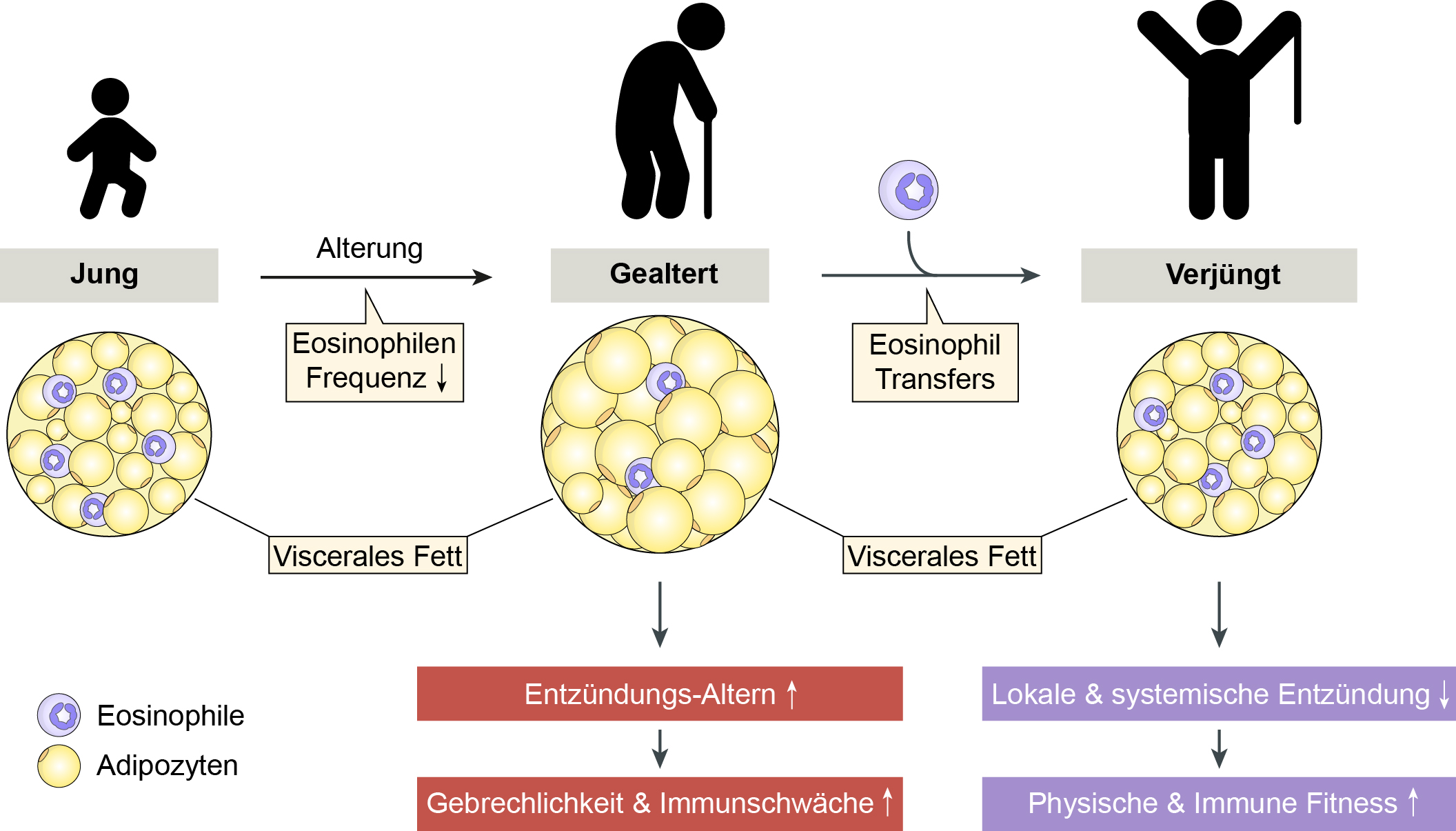 Die Forschenden um Noti und Eggel konnten zeigen, dass bestimmte Immunzellen, sogenannte Eosinophile, die vorwiegend im Blut vorkommen, auch im Bauchfett von Menschen und Mäusen zu finden sind, und dass sie dort Entzündungsprozesse regulieren. Eosinophile sind Zellen des angeborenen Immunsystems und wehren unter anderem Parasiten ab, können aber durch eine überschiessende Reaktion auch zu Atemwegserkrankungen führen. Mit zunehmendem Alter sinkt der Anteil von eosinophilen Zellen im Fettgewebe, während die Anzahl an entzündungsfördernden Makrophagen zunimmt. Die Verschiebung dieser Immunzell-Balance hat zur Folge, dass Bauchfett im Alter zum chronischen Entzündungsherd wird.