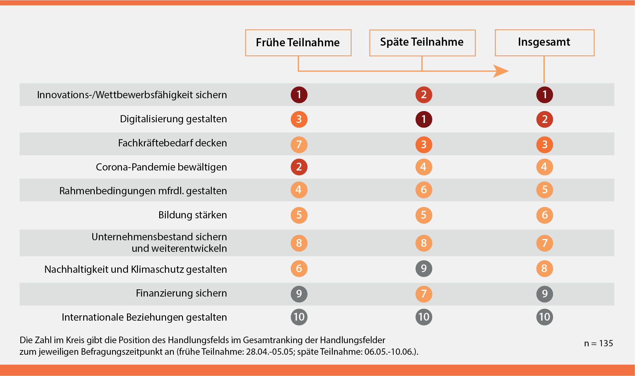 Die mittelständischen Unternehmen haben sich weitestgehend auf die "neue Normalität" als Folge der Corona-Krise eingestellt. Entsprechend stehen laut einer Sonderauswertung zum "Zukunftspanel Mittelstand" nun die Herausforderungen "Stärkung der Innovations- und Wettbewerbsfähigkeit", "Digitalisierung" und "Den Fachkräftebedarf decken" wieder vorrangig im Fokus der Geschäftsführungen. Für die Sonderauswertung waren im Zeitraum von März bis Juni Vertreter und Vertreterinnen aus Wirtschaft, Wissenschaft und Wirtschaftspolitik online befragt worden.