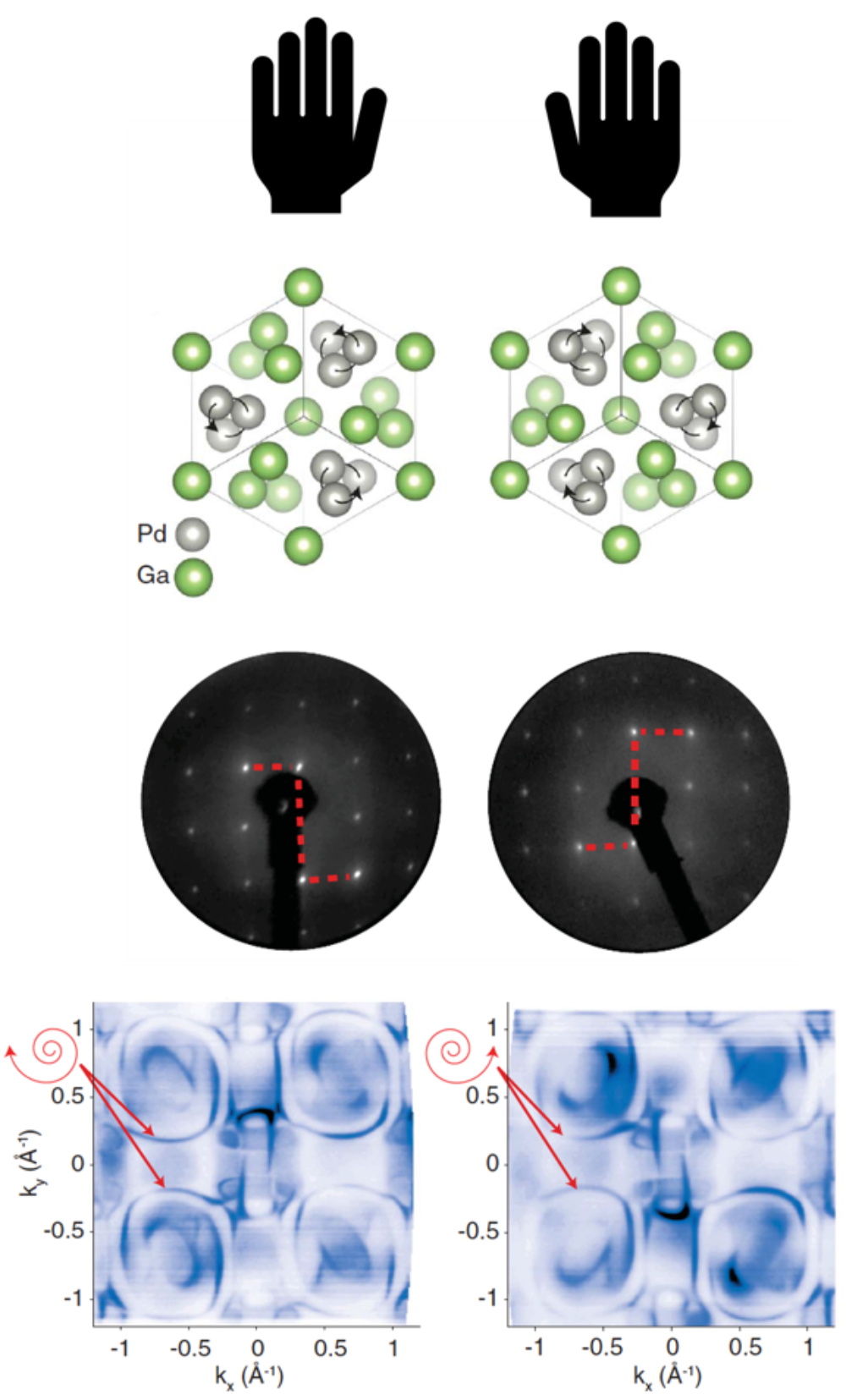 The team went one step further, beyond the observation of a maximal Chern number. They showed that the chiral nature of the PdGa crystals offers a possibility to control the sign of that number as well. To demonstrate such control, they grew samples that were either left- or right-handed (see the figure). When they looked then at the electronic structures of the two enantiomers, they found that the chirality of the crystals is reflected in the chirality of the electronic wave function. Taken together, this means that in chiral semimetals the handedness, which can be determined during crystal growth, can be used to control topological phenomena emerging from the behaviour of the electrons in the material. “Control of structural chirality is a very tricky process. We had to use a modified self-flux technique to grow the opposite enantiomorph single crystals of PdGa” says Kaustuv Manna, one of the authors of the study who grew the PdGa single crystals and works as a scientist at Max Planck Institute for Chemical Physics of Solids Dresden.