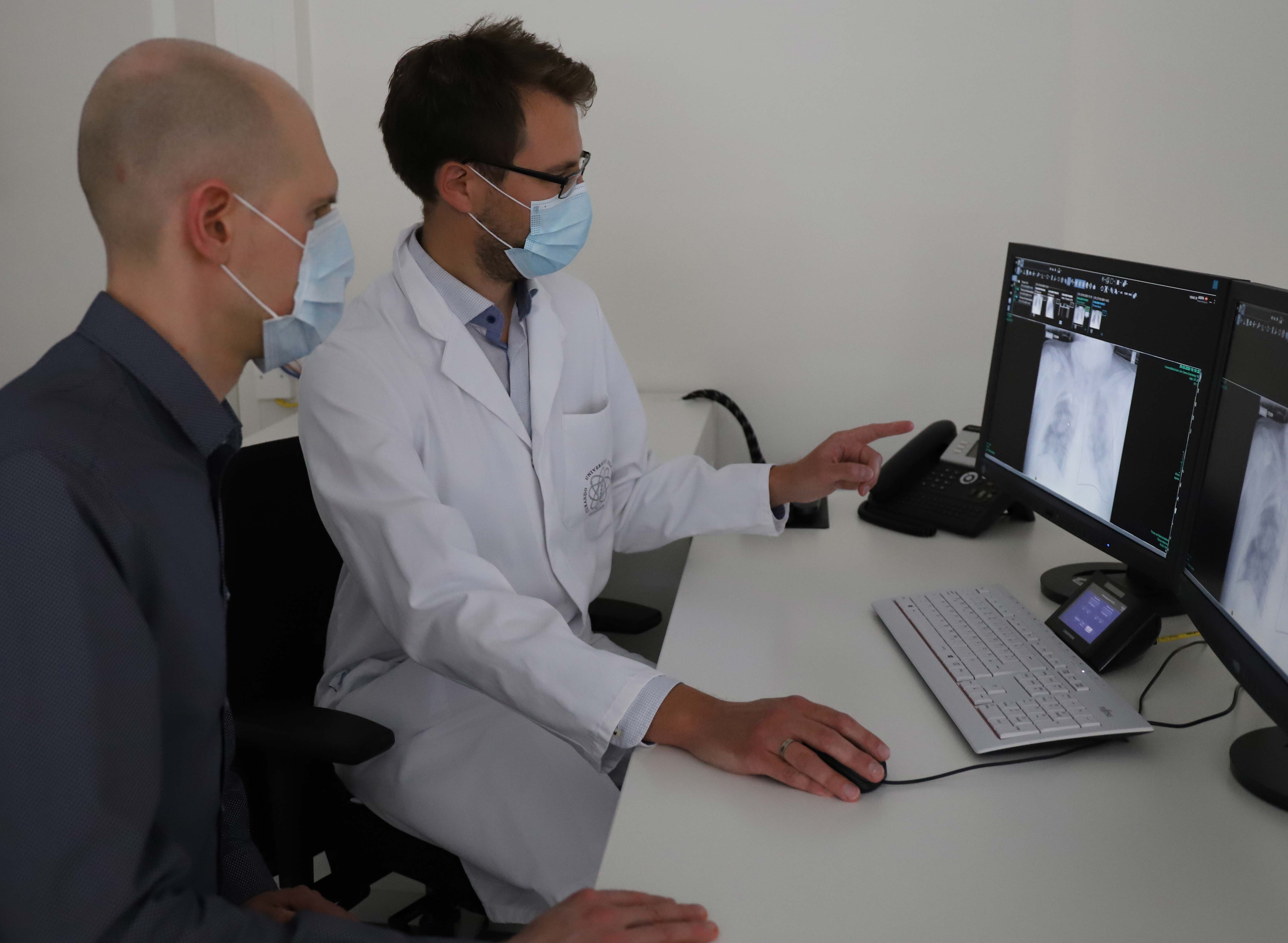 Für die Auswertung der Röntgenaufnahmen trainieren Professor Dr. Reinhold von Schwerin und Doktorand Daniel Schaudt von der THU eine Künstliche Intelligenz, die mithilfe eines besonderen Deep Learning Verfahrens, dem sogenannten Transfer Learning, bereits mit wenigen Trainingsdaten vielversprechende Ergebnisse liefern kann. Bei dieser Technik werden vortrainierte vielschichtige (auch: tiefe) Netze, die bereits gelernt haben, welche Merkmale in einem Bild wichtig sind, auf ein spezielles Problem adaptiert. „Die stetig steigenden Möglichkeiten der durch Künstliche Intelligenz gestützten Bildanalyse sind auch auf Röntgenbilder anwendbar. Erste Versuche an der THU mittels Convolutional Neural Networks , einem speziellen, in der Bildanalyse häufig eingesetzten Deep Learning Verfahren, haben gezeigt, dass Künstliche Intelligenz eine erste Einschätzung über das Vorliegen einer Coronavirus-Erkrankung geben kann“, sagt Professor von Schwerin. Für das Training der KI ist ein zeitnahes Heranziehen von anonymisierten Röntgenaufnahmen der Lunge von 1500 Patient*innen der Klinik für Diagnostische und Interventionelle Radiologie in den nächsten Monaten geplant. Bevor die KI mithilfe der Aufnahmen lernen kann, ist aber medizinisches Wissen gefragt. Die klinischen Informationen zu den Röntgenbildern sollen von Doktorand Andreas Hinteregger und Facharzt Dr. Christopher Kloth aus der Klinik für Diagnostische und Interventionelle Radiologie zusammengetragen werden. „Wir werden die Lungenkonturen und die Infiltrate, also die entzündlichen Veränderungen des Lungengewebes durch Covid-19 auf den Röntgenbildern einzeichnen, damit die Software daraus lernt und anschließend diese jeweils selbstständig erkennen kann“, erläutert Dr. Kloth.