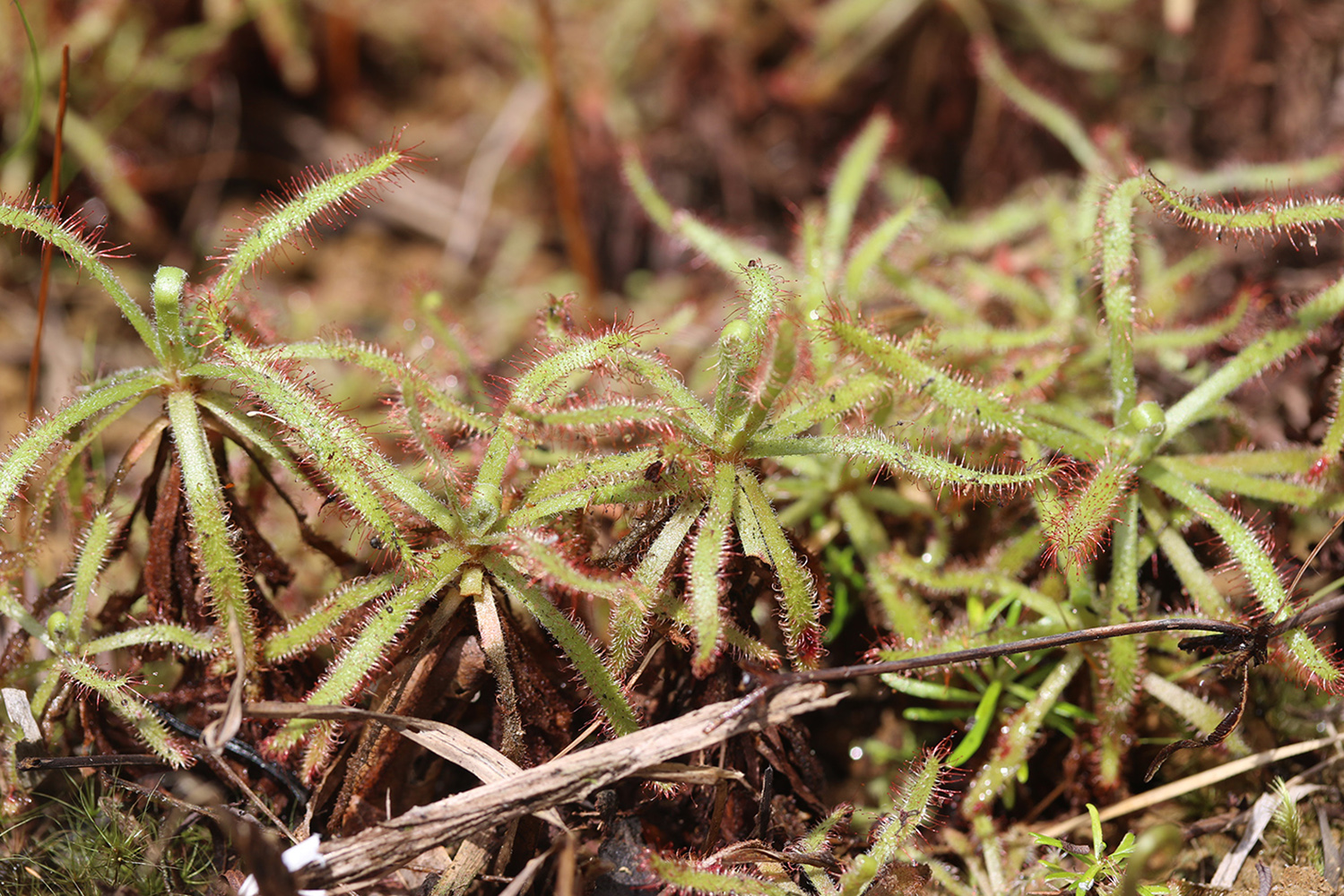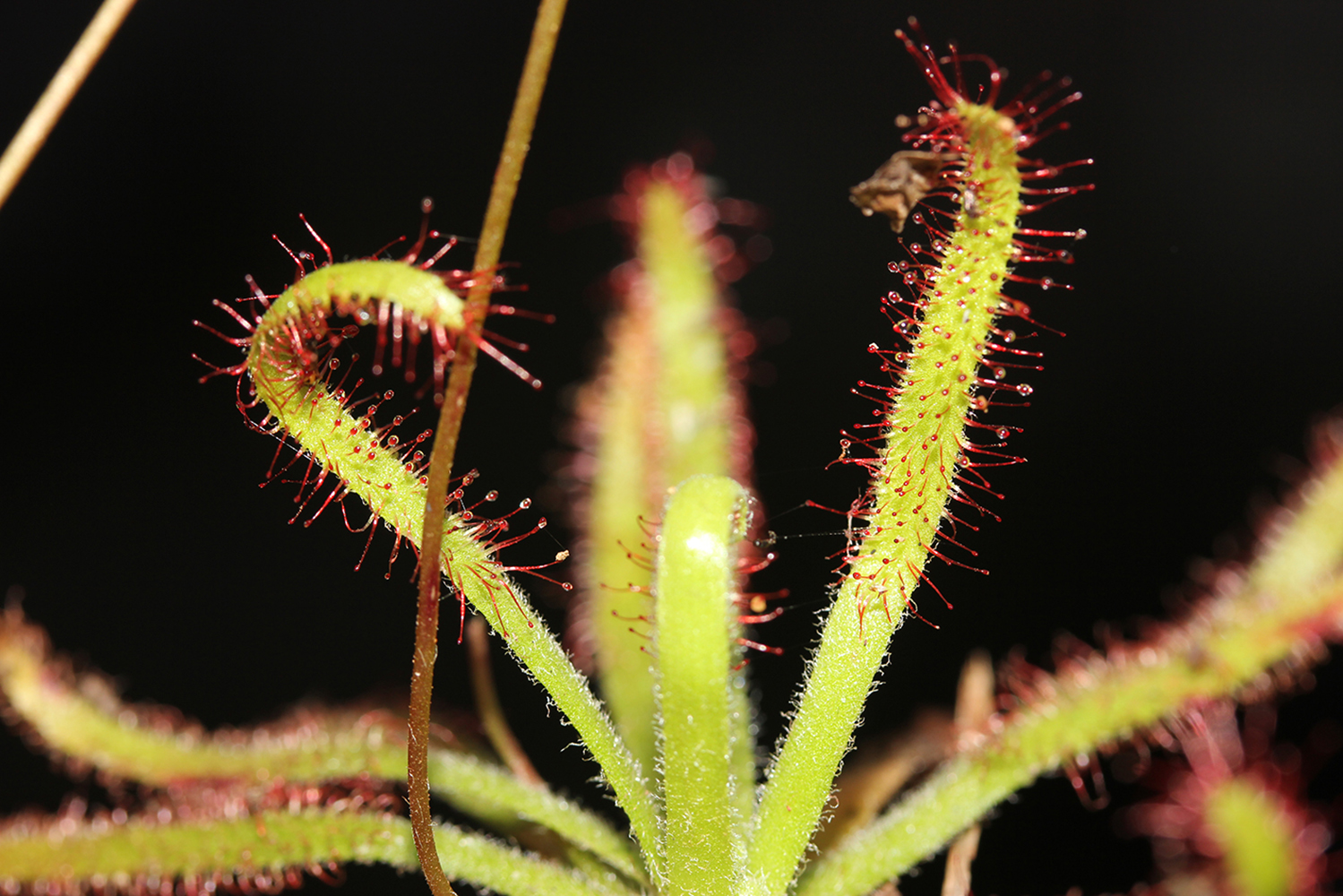 Die Gattung Drosera, Sonnentau, stellt weltweit die größte Gruppe von fleischfressenden Pflanzen dar und umfasst etwas mehr als 250 Arten. Die meisten davon kommen auf der Südhalbkugel vor, insbesondere in Australien, Südafrika und Brasilien. Sonnentau-Pflanzen haben Blätter, die dicht mit karnivoren Drüsen, sogenannten Tentakeln, besetzt sind, die klebrige Schleimtröpfchen ausscheiden. Diese glitzernden Tröpfchen auf den meist leuchtend roten Tentakeln sind wirkungsvolle, attraktive und doch tödliche Lockfallen für kleine Tiere, insbesondere fliegende Insekten. Bei vielen Sonnentau-Arten sind die Tentakel und sogar die Blätter zu Bewegungen fähig, und krümmen sich um die gefangene Beute, die dadurch mit immer mehr des klebrigen Schleims in Berührung kommt, und schließlich erstickt. Die Beute wird anschließend von Enzymen verdaut, die die Pflanze produziert. Die Nährstoffe, die die Pflanzen von dieser tierischen Mahlzeit erhalten, kompensieren die Nährstoffarmut der Böden, auf denen die allermeisten fleischfressenden Pflanzen vorkommen.