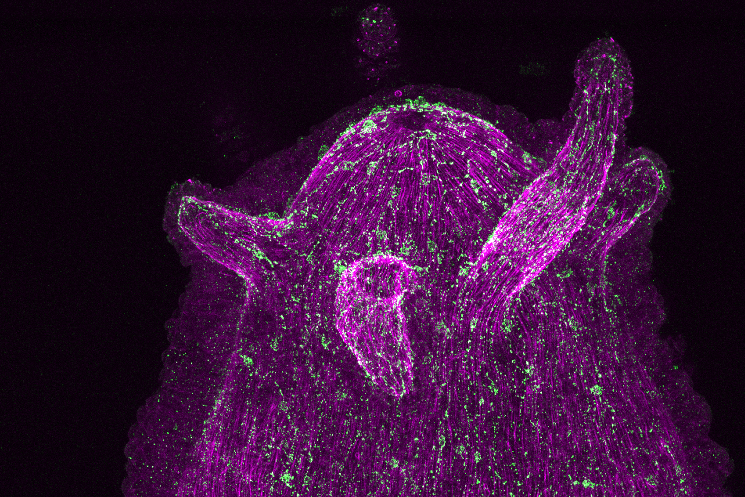 https://www.uni-kiel.de/de/pressemitteilungen/2020/168-klimovich-pnas-juvenile.jpg Bildunterschrift: Eine Neuronenpopulation in Hydras diffusem Nervennetz exprimiert Neuropeptide (in grün), die mittels spezifischer Antikörper sichtbar gemacht werden. Die Zellkerne sind in Magenta eingefärbt.