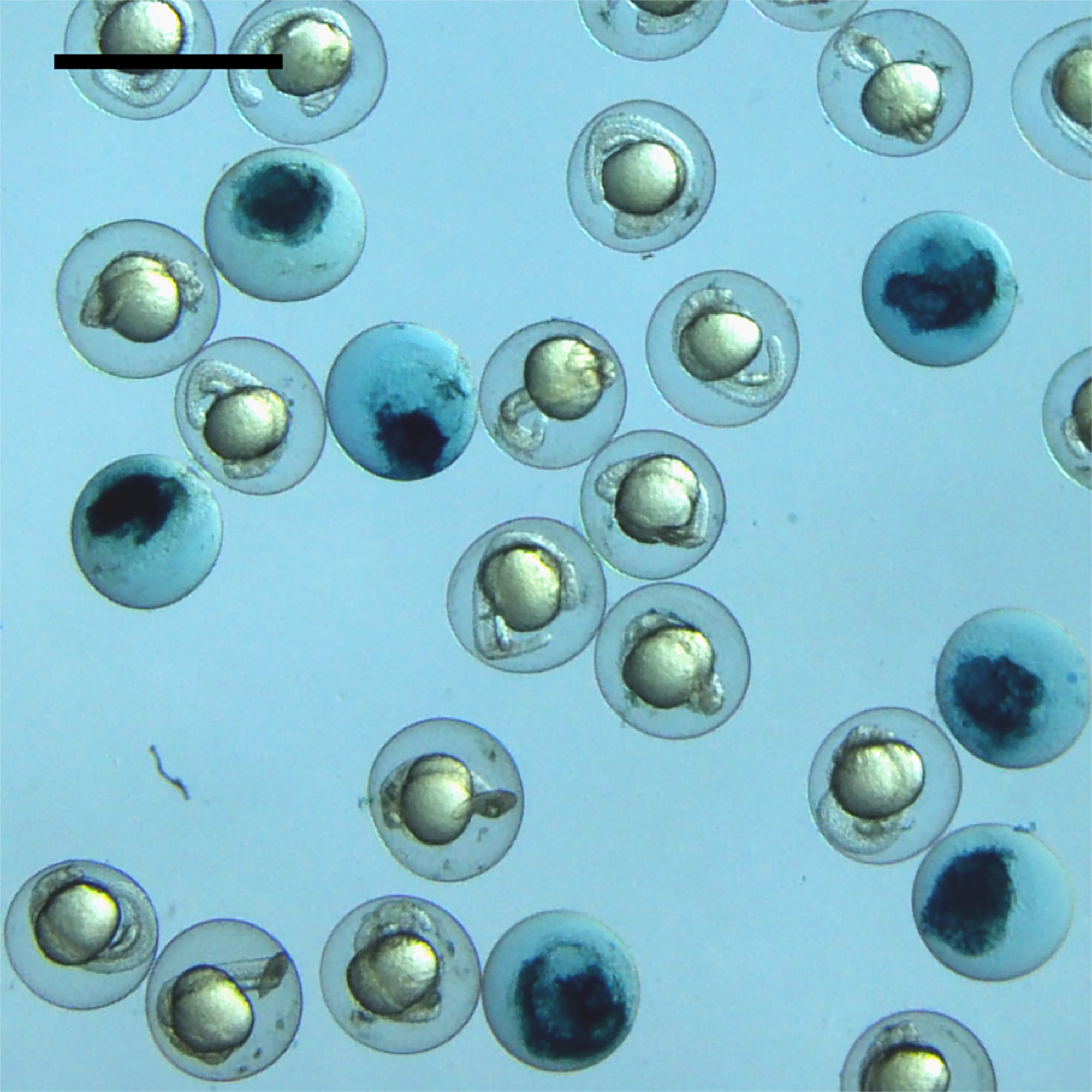 Das Bild zeigt Eier von Zebrafischen während der Entwicklung. Ein Verlust des Glutaredoxin 5 führt zum Absterben während der Entwicklung (dunkle Eier). Dieser Effekt kann nur durch Glutaredoxine kompensiert werden, die im Eisenstoffwechsel aktiv sind. – Foto: Carsten Berndt