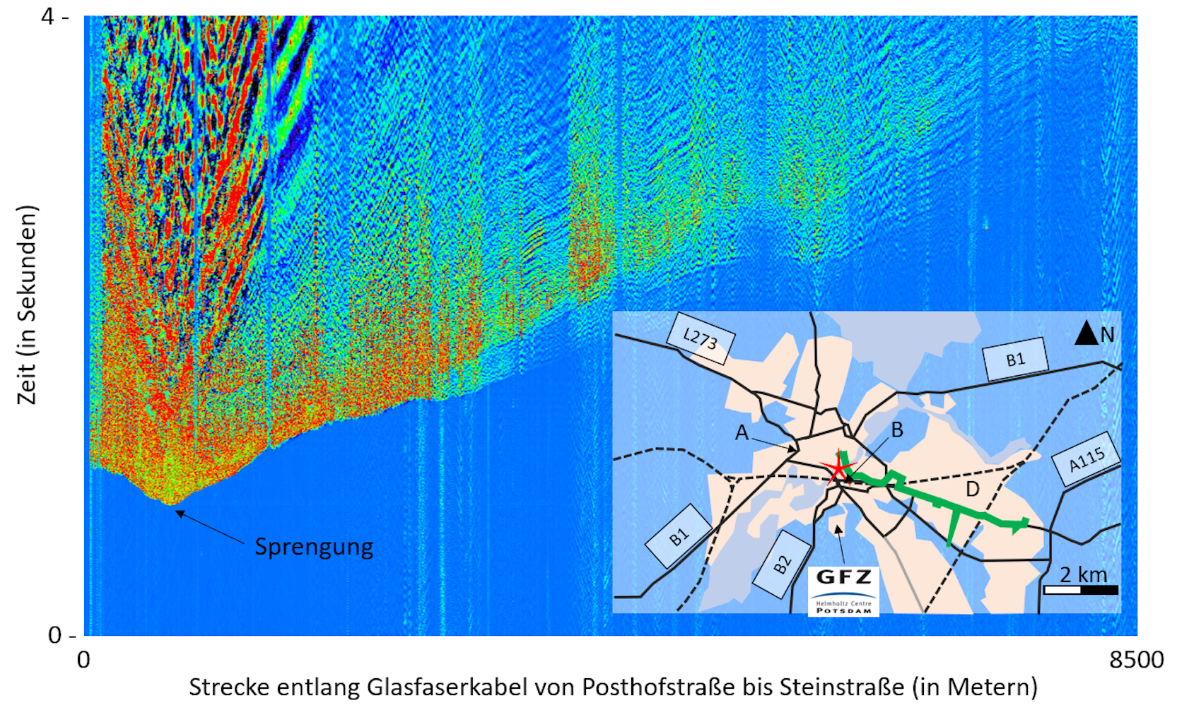 Forschende des Deutschen GeoForschungsZentrums in Potsdam haben eine gezielte Sprengung einer Weltkriegsbombe in Potsdam als Signalquelle für eine Messung genutzt, bei der sie konventionelle Messverfahren mit einer neuartigen faseroptischen Messtechnologie kombinierten. Das führte zu einer besonders hohen Datendichte und Datenqualität.