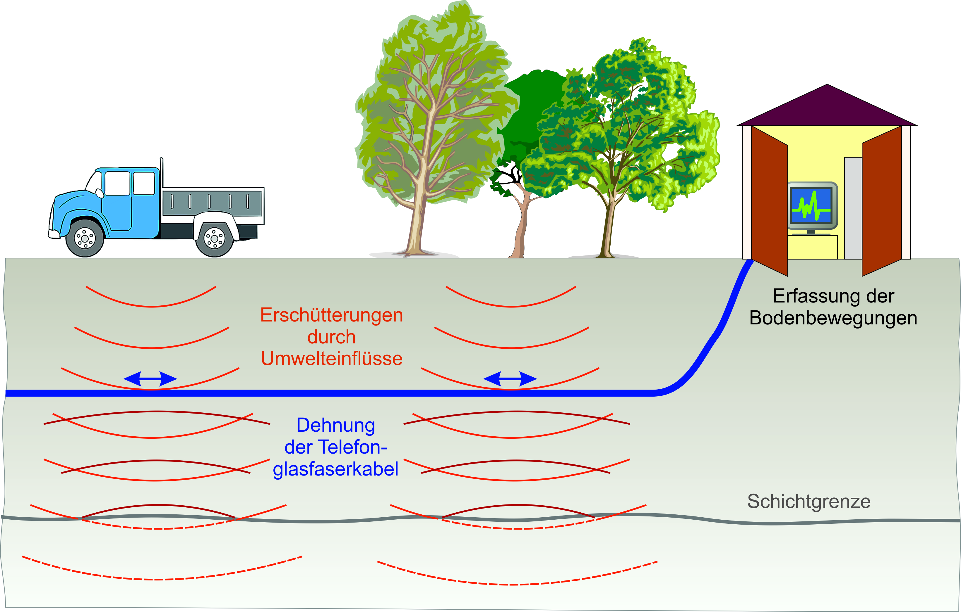 Einflüsse wie Wind und Fahrzeuge erzeugen Bewegungen an der Erdoberfläche, die sich als elastische Wellen in den Boden fortpflanzen. Jede geologische Schicht und Struktur im Untergrund bedingt eine spezifische Ausbreitung der Wellen, was zu einem charakteristischen Bewegungsbild führt. Entlang der Glasfaserkabel entstehen dabei lokale Dehnungs- und Kompressionsbewegungen, die mit Messgeräten aufgezeichnet werden. ( B. Schöbel)