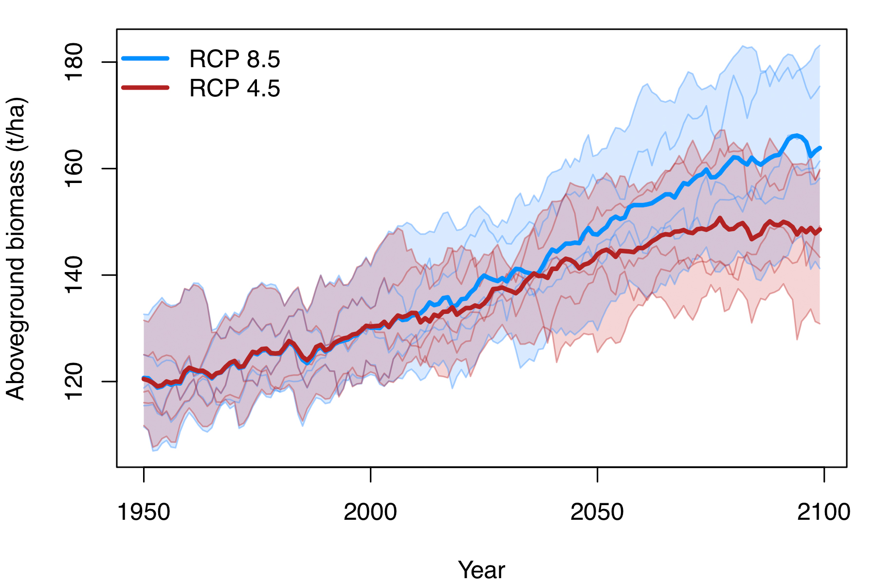 Die Zunahme der Höhe und der immergrünen Wuchsform ist vornehmlich Bäumen zuzuschreiben. Deshalb wird die holzige Biomasse in der gesamten Region – mit Ausnahme von Pakistan und Afghanistan – bis zum Ende des Jahrhunderts ebenfalls signifikant steigen. Scheiter dazu: „Wir haben für die oberirdische Biomasse in den asiatischen Tropen im Zeitraum 2080 bis 2099 bei sehr hohen Treibhauskonzentrationen ein Plus von 22,8 Prozent gegenüber heute berechnet. Bei moderaten Treibhauskonzentrationen ist ein Plus von 12,7 Prozent zu erwarten.“