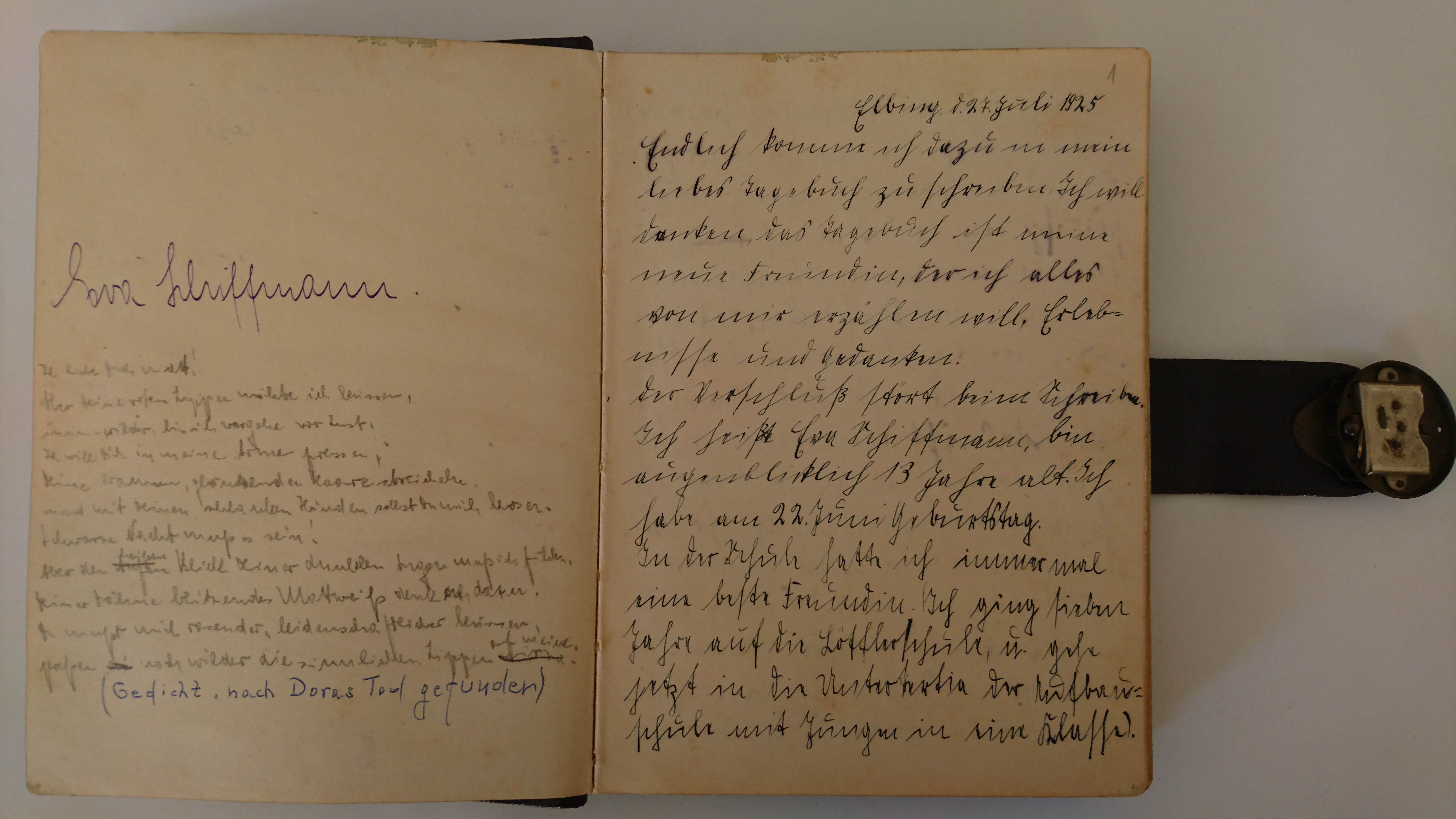„Endlich komme ich dazu in mein liebes Tagebuch zu schreiben.“ Mit diesem Satz begann die 13-jährige Eva Schiffmann ihr Tagebuch, das sie von 1925 bis 1930 führte. In ihm hielt sie auf 91 Seiten Begebenheiten des Alltags in ihrer Heimatstadt Gotha fest, aber auch ihre Ansichten zum neuen Frauenbild oder ihrem jüdischen Glauben. Außerdem schrieb sie über zahlreiche Bücher, Filme und Theatervorstellungen. Eva Schiffmann ist für heutige Leserinnen und Leser auch eine Chronistin der Kulturgeschichte der Weimarer Republik.