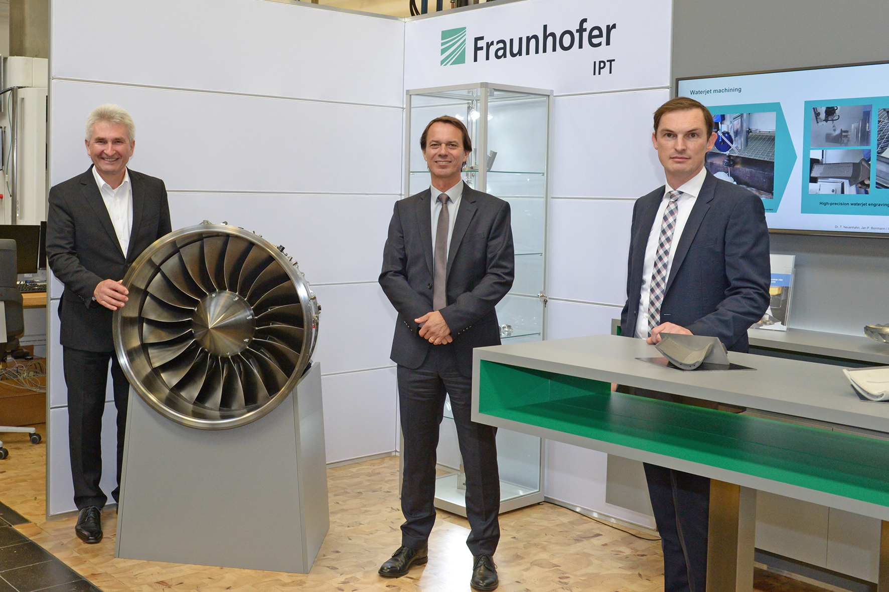 In einer kurzen Live-Demonstration, für die der Minister den Startknopf drückte, wurden mit dem Wasserabrasivstrahl 3D-Geometrien in die obersten Schichten einer Laufschaufel aus einer Siemens-Gasturbine eingebracht. Während der Einweihung zeigten Fraunhofer IPT und Siemens auch, welche Chancen die Forschungs- und Entwicklungsarbeiten zur Wasserstrahltechnologie in Aachen für den Strukturwandel im Rheinland eröffnen.
