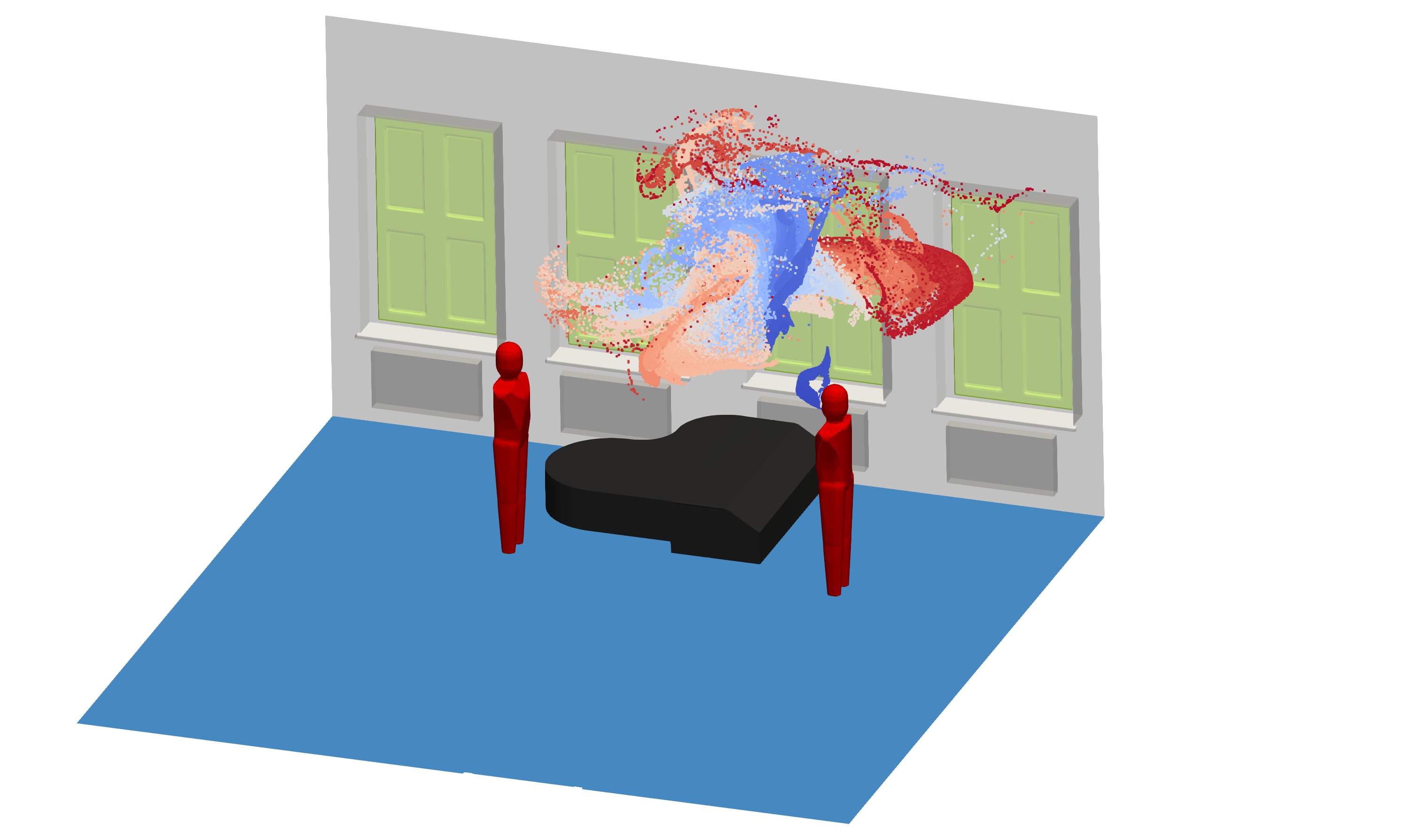 Dafür untersuchen die Wissenschaftler/innen des Instituts für Mechanik und Fluiddynamik der TU Bergakademie Freiberg mithilfe von Computersimulationen die Ausatmung und Ausbreitung der Aerosole in der Raumluft. Die Ergebnisse zeigen, wie Aerosole beim Singen, Sprechen oder Atmen von Mensch zu Mensch transportiert werden und sollen ermöglichen, bisherige Hygienemaßnahmen weiter zu optimieren und damit zeitgleich auch einen Beitrag für die Bekämpfung des Coronavirus zu leisten.
