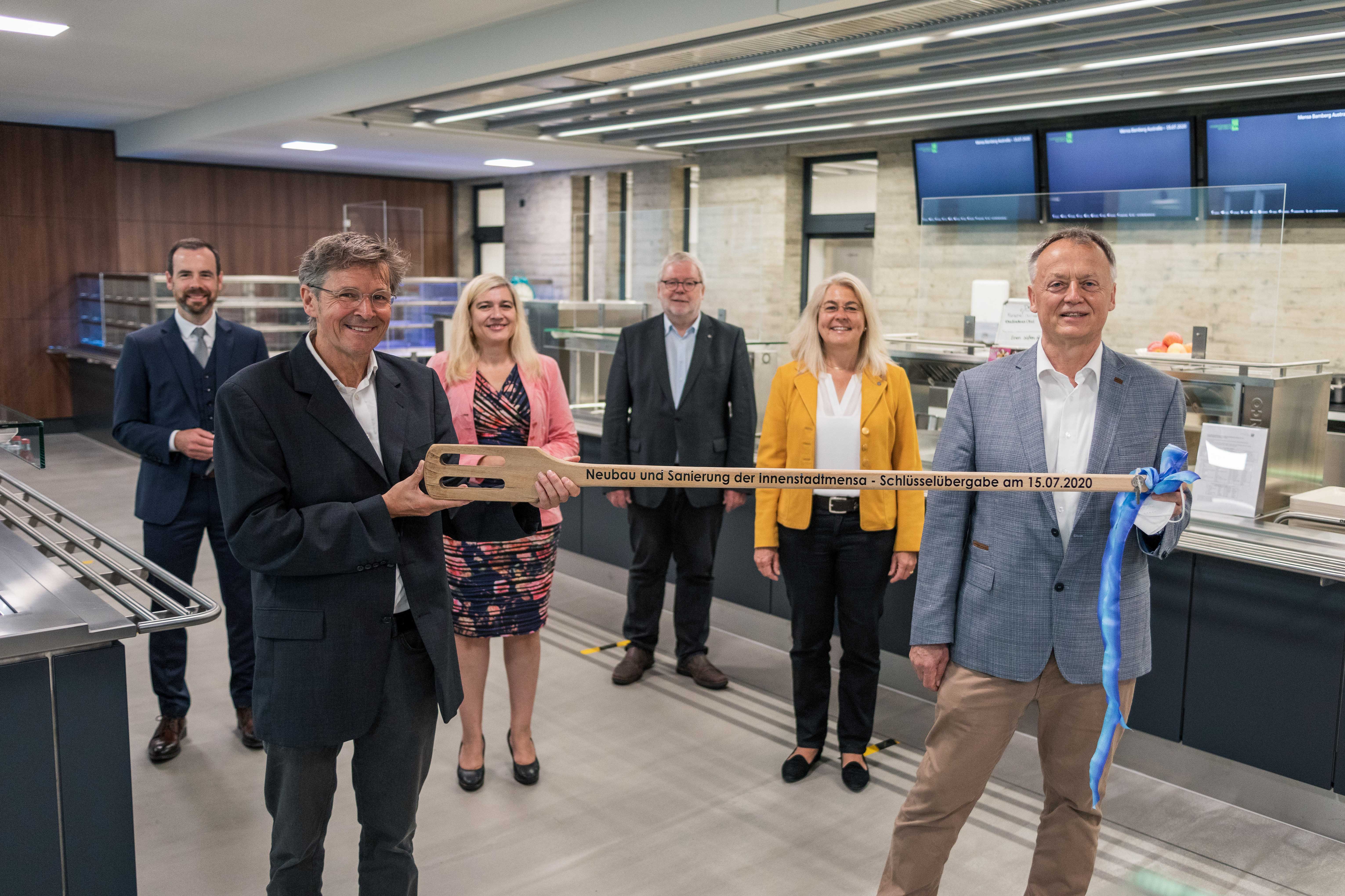 Zu einer gemeinsamen Besichtigung mit feierlicher Schlüsselübergabe trafen sich am 15. Juli 2020: Melanie Huml, bayerische Staatsministerin für Gesundheit und Pflege, der amtierende Universitätspräsident Prof. Dr. Dr. habil. Godehard Ruppert, der künftige Universitätspräsident Prof. Dr. Kai Fischbach, Kanzlerin Dr. Dagmar Steuer-Flieser, Jürgen König, Leiter des Staatlichen Bauamts Bamberg und Michael Ullrich, Geschäftsführer des Studentenwerks Würzburg.