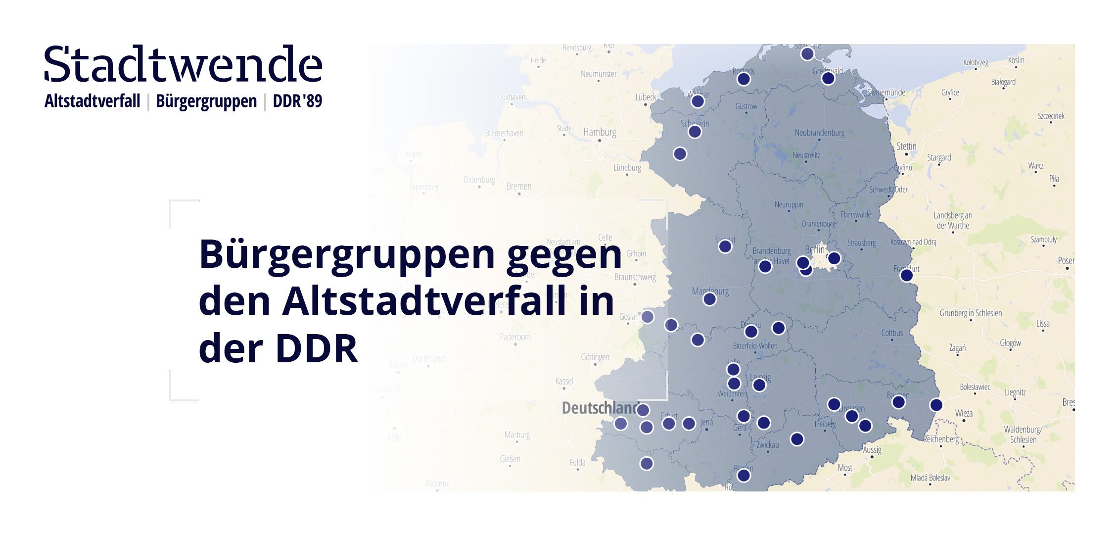 Als in den 1980er Jahren in der DDR vielerorts historische Innenstädte dem Verfall ausgeliefert wurden, regte sich Widerstand. Das Forschungsprojekt „Stadtwende“ dokumentiert die Geschichte der protestierenden Bürgergruppen, der beteiligten Institutionen, Orte und Personen auf einer eigenen Internetpräsenz. Diese Website, bislang nur als Beta-Version im Netz, erfährt nun einen Neustart: Ab dem 17.07.2020 ist die Seite stadtwende.de in neuem Design mit neuen Inhalten und mit voller multimedialer Funktionalität erreichbar. Zeitzeug*innen können über die Website Kontakt mit dem Projektteam aufnehmen.