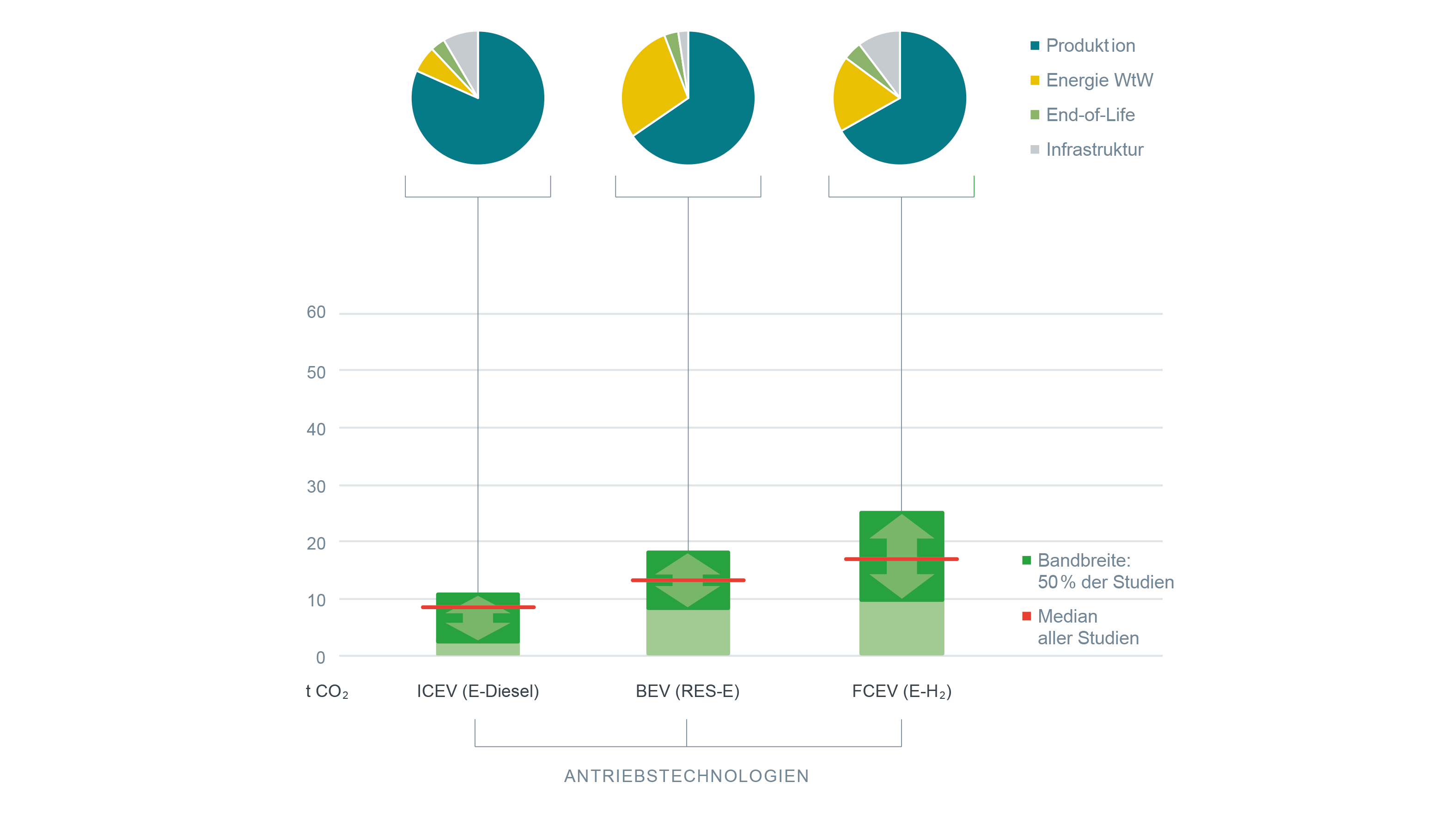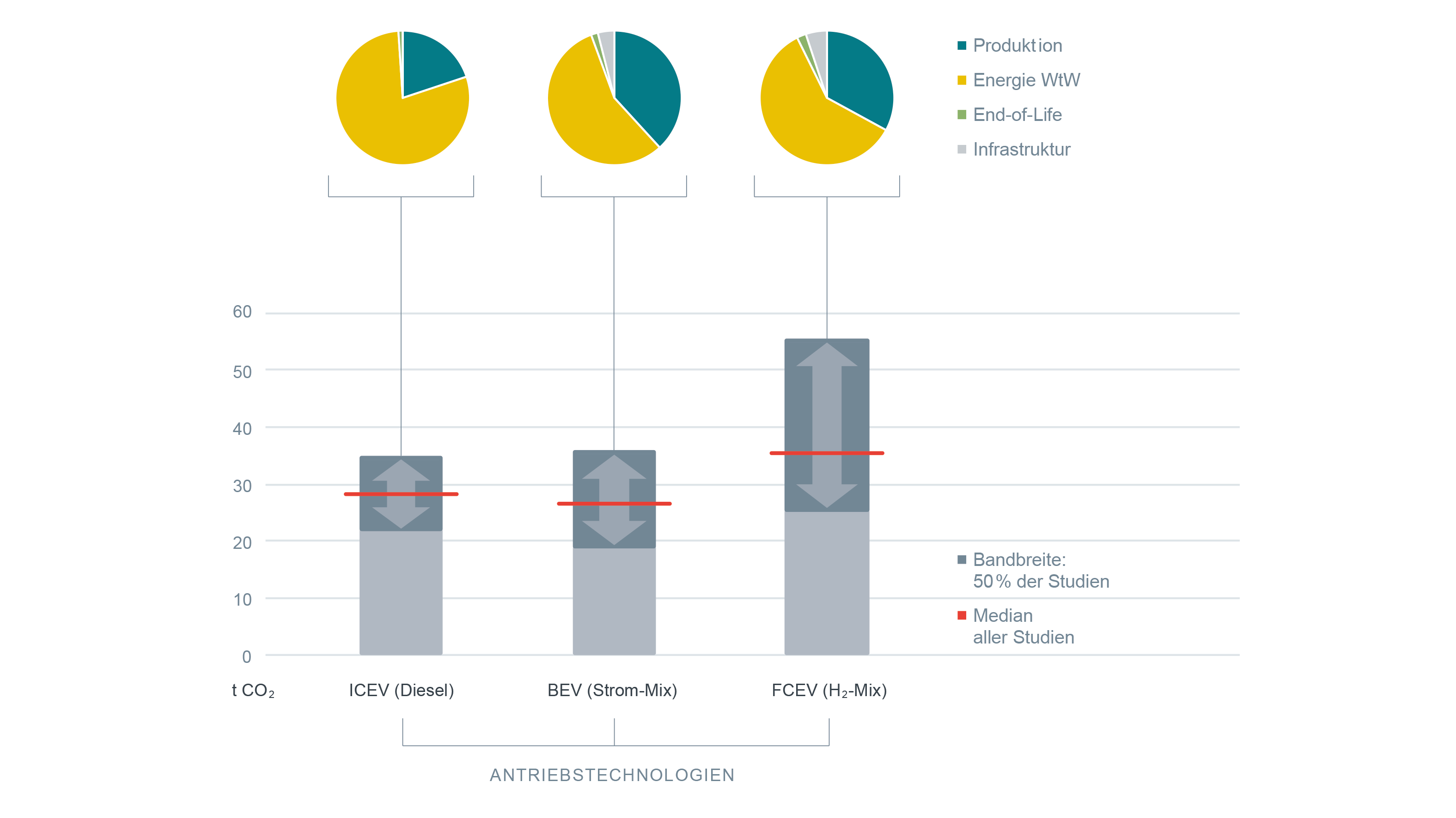 So gerechnet, ergibt sich für alle Kombinationen von Antrieben und Energieträgern ein relativ enges Band der Gesamtemission während der Lebenszeit. Der Durchschnittswert über alle Studien reicht von 25 bis 35 Tonnen CO2 pro Fahrzeug, sofern fossile Energieträger noch anteilig für die Herstellung von Strom, Wasserstoff oder synthetischen Kraftstoffen eingesetzt werden. Kommen im Betrieb hingegen ausschließlich regenerativ erzeugte Energieträger zum Einsatz, ergibt sich ein Durchschnittswert von 9 bis 16 Tonnen CO2 für das gesamte Fahrzeugleben. Die verbleibenden Emissionen resultieren dann im Wesentlichen aus der Produktion der Fahrzeuge, den Anlagen für die Herstellung sowie der Infrastruktur für die Distribution der Energieträger. Insgesamt sind hinter den Durchschnittswerten der Ergebnisse dieser Studie große Abweichungen zwischen den einzelnen Studien zu verzeichnen, die oft ein Vielfaches der Unterschiede zwischen den einzelnen Technologien betragen. „Es gibt keine klare Gewinnertechnologie“, fasst Dr. David Bothe von Frontier Economics zusammen. „Vor allem aber zeigt die Metastudie, wie groß die Unsicherheit bei Lebenszyklusanalysen derzeit noch ist.“