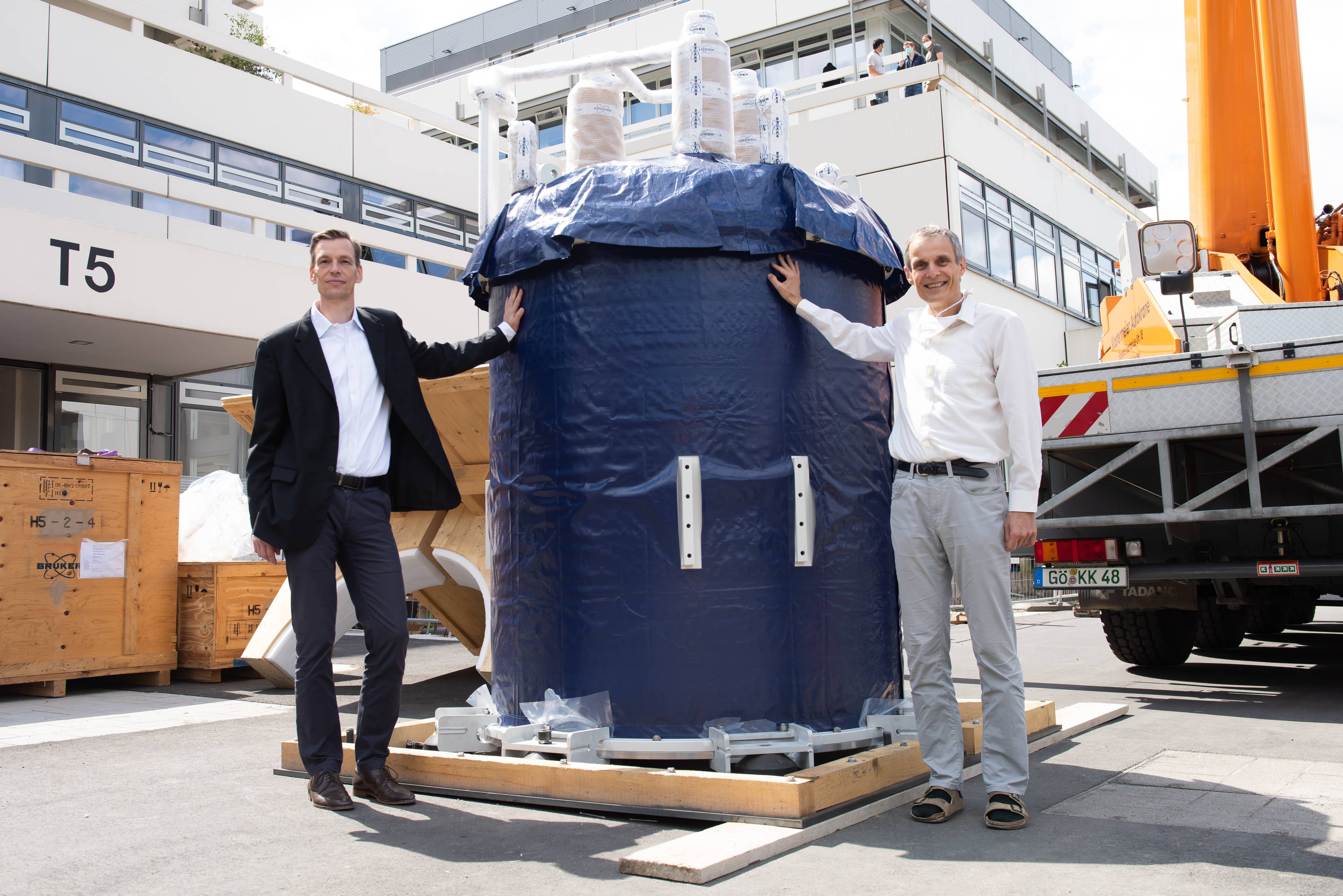 Ein 60-Tonnen-Kran und zwei Sattelschlepper waren nötig, um das neue NMR-Spektrometer unversehrt in der eigens gebauten Halle am Institut aufzustellen. Die innovative Technik wird den Teams um die Strukturbiologen Christian Griesinger und Markus Zweckstetter künftig ermöglichen, ihre Forschung auf dem Gebiet neurodegenerativer Erkrankungen weiter auszubauen. Auch neue Erkenntnisse in der Krebs- und Infektionsforschung erhoffen sich die Göttinger NMR-Experten.