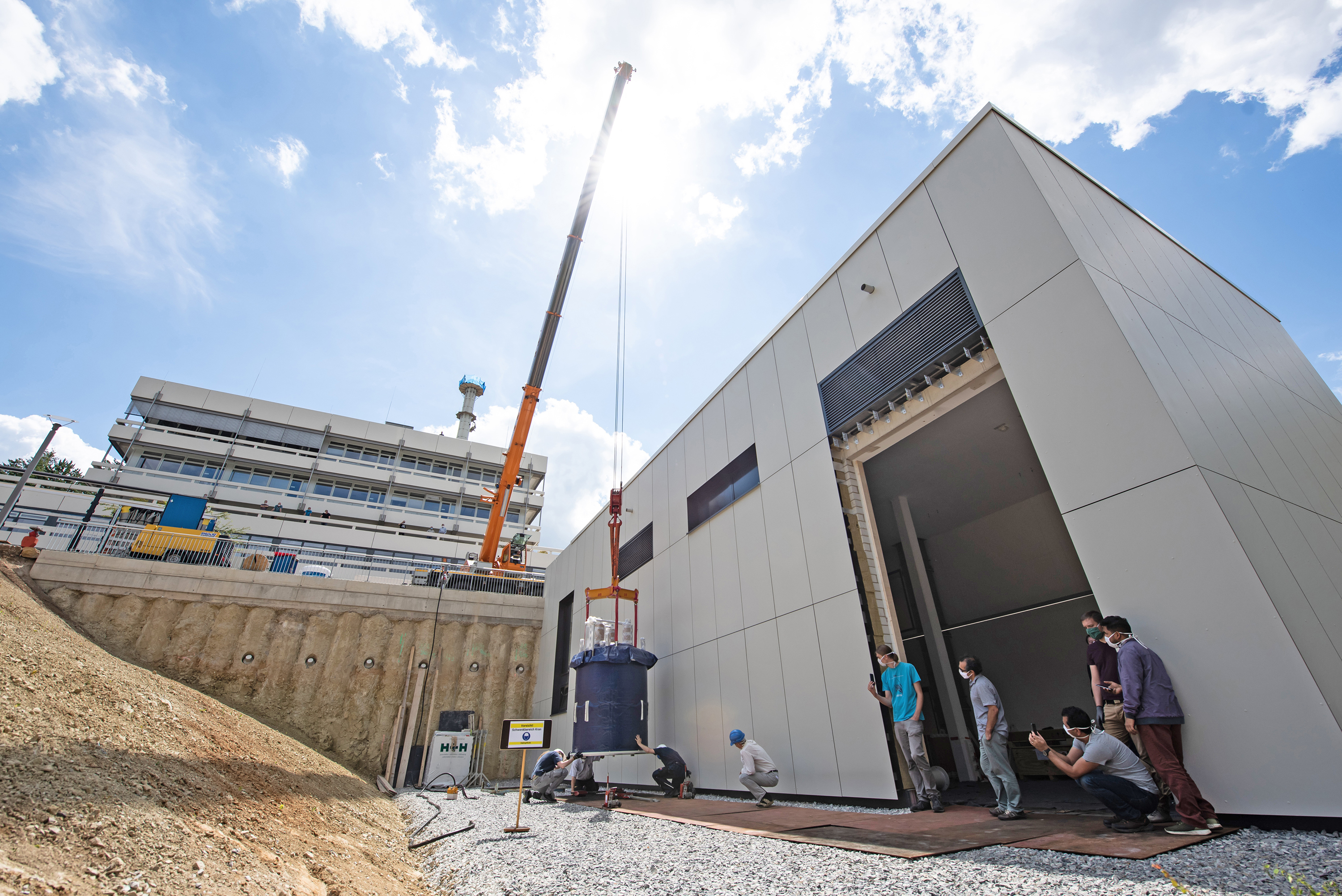Für das neue Hochleistungsgerät ist in 19 Monaten Bauzeit auf dem Institutsgelände eine weitere NMR-Halle entstanden – und zwar maßgeschneidert: So durfte nahe der zukünftigen NMR-Spektrometer kein Stahl im Gebäude verbaut werden; damit besitzt das Gebäude eine aufwändige Statik. Dicke Fundamente stellen zudem sicher, dass keinerlei Schwingungen von innen und außen die empfindlichen Messungen stören. Nicht zuletzt reagieren die Experimente auf kleinste Temperaturschwankungen, sodass hohe Anforderungen an die Heizungs-und Lüftungsanlagen zu erfüllen waren.