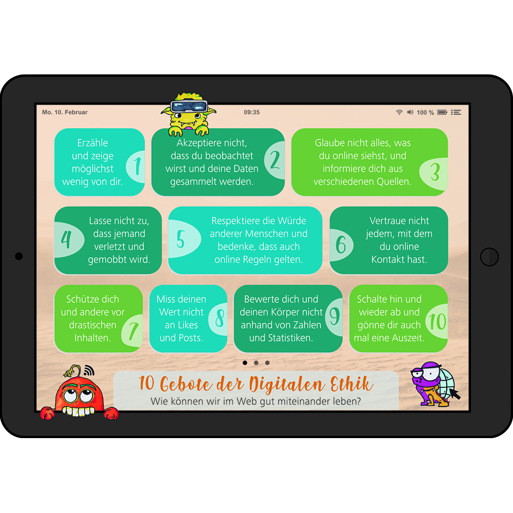 Die Digitalisierung bringt stetige Veränderung mit sich. Netzwerke wie beispielsweise Facebook zählen bei Jugendlichen nicht mehr zu den Nutzungsfavoriten. Heute sind es vielmehr soziale Netzwerke wie Instagram, TikTok oder die Streaming-Plattform Twitch, die von Jugendlichen bevorzugt genutzt werden. In der Neuauflage der "10 Gebote" wurden veraltete Nutzungsweisen durch aktuelle Trends und Veränderungen in der digitalen Welt ersetzt und anhand neuer Geschichten erzählt. Hilfe bei der Konzeption bekamen die Studierenden von den Medienscouts der Beratungsplattform JUUUPORT. Sie konnten ihre Erfahrungen aus der Online-Beratung von Jugendlichen für Jugendliche mit einbringen und in die Geschichten einfließen lassen. Neben den Geschichten wurde auch das Design modernisiert. Die Postkarte und das Booklet sind in zwei unterschiedlichen optischen Varianten erhältlich. Für Kinder im Grundschulalter und für Jugendliche wird eine Version angeboten. Das Material kann über JUUUPORT (infomaterial@ juuuport.de) gegen einen Druckkostenbeitrag bestellt werden oder von der Webseite des Instituts für Digitale Ethik kostenlos heruntergeladen werden.
