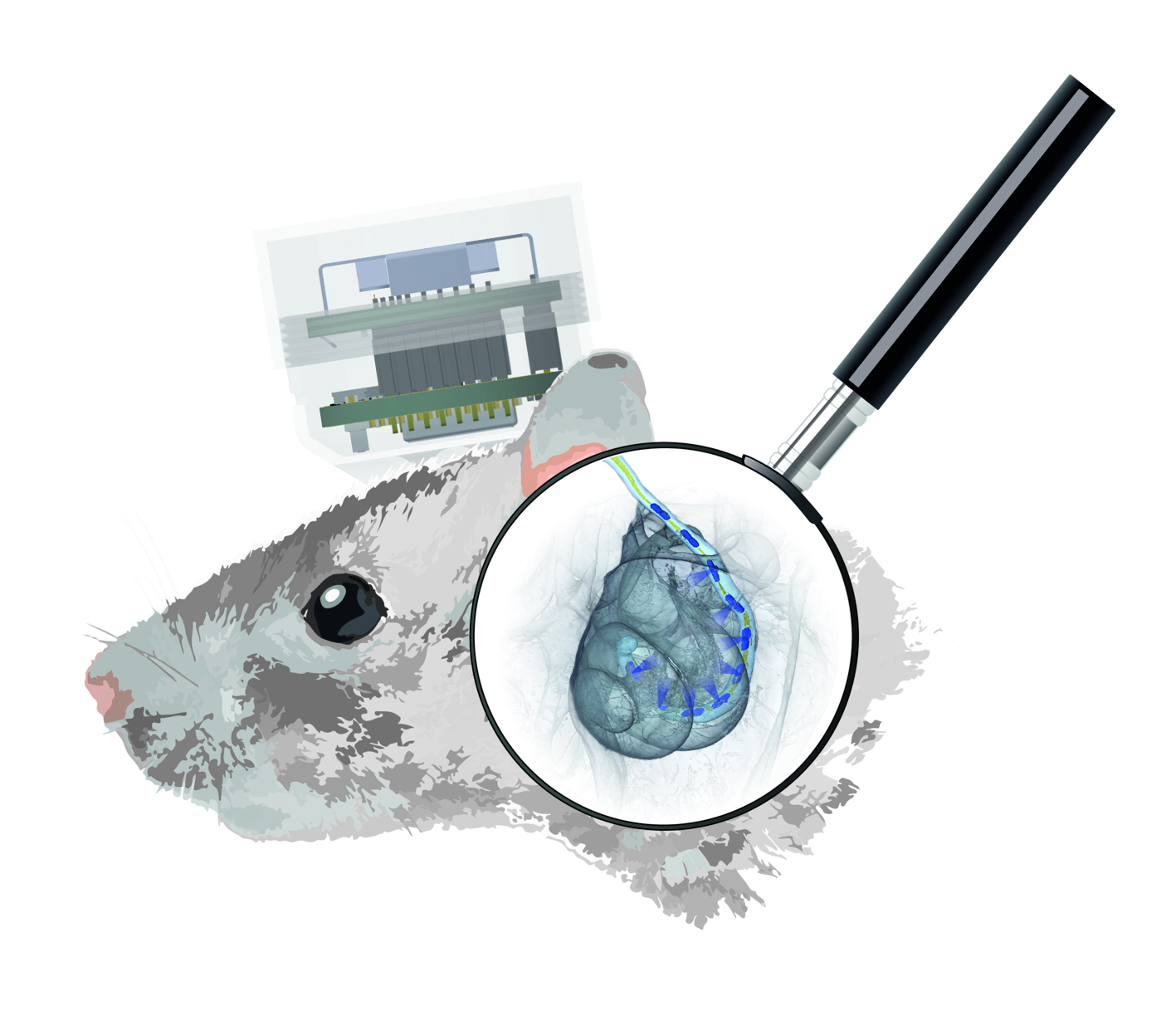 The development of a mobile processor at the Institute for Auditory Neuroscience in Göttingen has been equally important for the success of behavioural experiments running over several weeks. The small computing unit converts ambient sound into electrical signals via an integrated microphone and transmits them to the optical CI. The miniaturization of the optical cochlear implant for testing in rodents was another challenge for the interdisciplinary team of scientists. To be worn by the animals without any problems in behavioural experiments, the system should be as light as possible. The entire CI just weighs 15 grams, which corre-sponds to about a tablespoon of sugar.