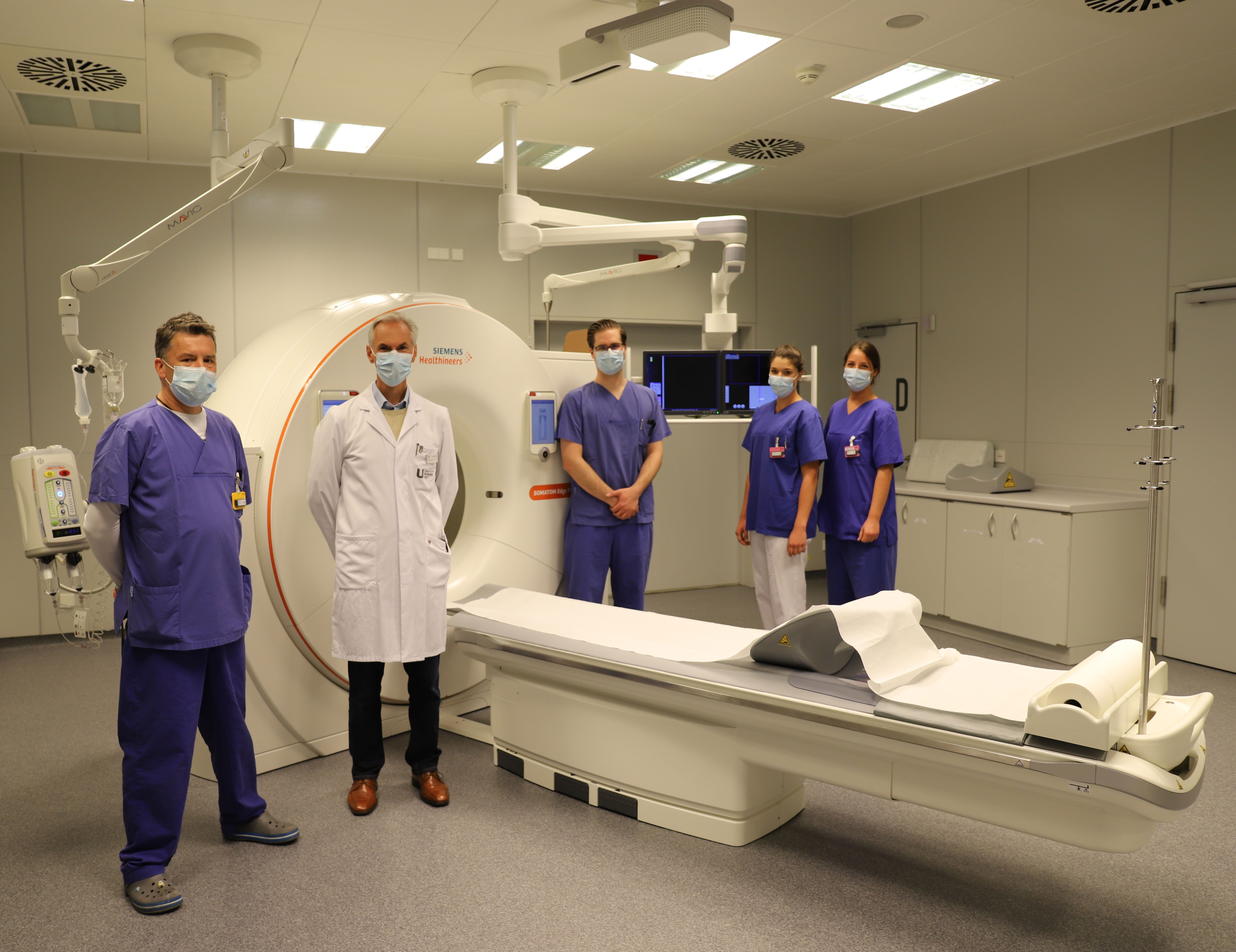In der ZINA werden alle chirurgischen und internistischen Notfall-Patient*innen des Standortes Oberer Eselsberg versorgt. So unterschiedlich ihre Erkrankungen oder Verletzungen auch sind, von dem neuen CT-Gerät profitieren alle. „Das Gerät gehört zu den bestausgestatteten CTs die in den Notaufnahmen der Region und weit darüber hinaus im Einsatz sind“, erklärt Professor Beer. Die geringere Strahlendosis kommt vor allem sensiblen Patientengruppen zu Gute, etwa Kindern oder Frauen im gebärfähigen Alter. Frische Frakturen, z.B. nach einem Unfall, können bei chirurgischen Notfällen noch besser und schneller erkannt und so zusätzliche Untersuchungen vermieden werden. Internistische Notfall-Patient*innen profitieren durch die hervorragende zeitliche Auflösung von den Möglichkeiten einer nicht-invasiven Herz-Bildgebung.