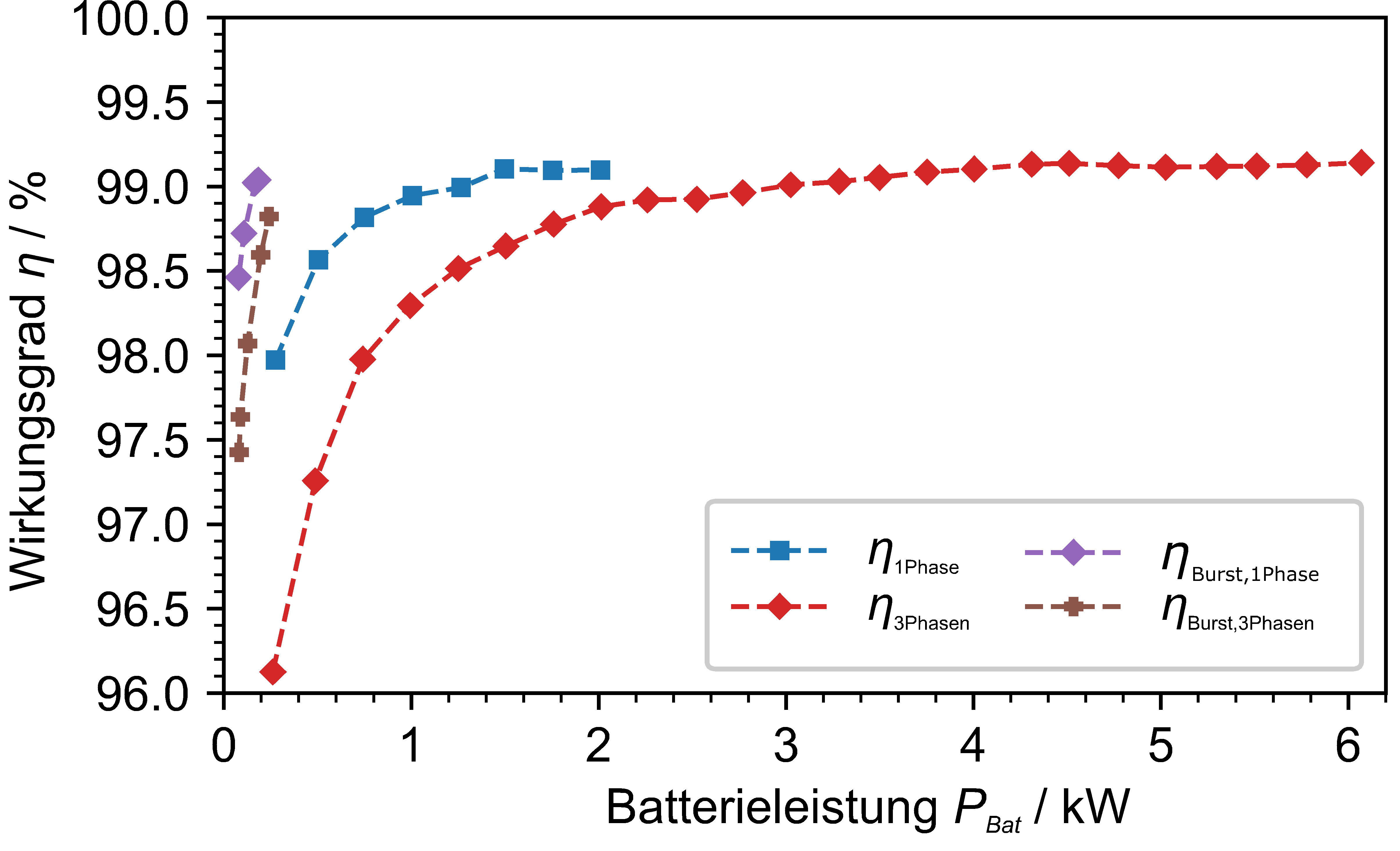 Zur Optimierung des Teillastwirkungsgrades wurden im Rahmen des Forschungsprojektes verschiedene Ansätze simulativ untersucht und die besten Konzepte prototypisch umgesetzt. Die Optimierungen bezogen sich sowohl auf die Hardware als auch auf Weiterentwicklungen der Software zur Ansteuerung der Leistungselektronik. Schaltungstechnisch wurden zunächst verschiedene Topologien untersucht und hinsichtlich des Teillastwirkungsgrades bei geringen Leistungen bewertet. Unter Berücksichtigung verschiedener Bewertungsparameter wurde ein 3-phasiger Synchronwandler für den Hochvolt-Batteriesteller ausgewählt und aufgebaut. Dieser ermöglicht es, durch die Aktivierung bzw. Deaktivierung einzelner Wandlerbrücken den Leistungsbereich gezielt anzupassen (1/3, 2/3, Volllast). Für sehr geringe Leistungen wird zusätzlich ein entsprechender Betriebsmodus mit variabler Schaltfrequenz zur Ansteuerung mit möglichst geringen Schaltverlusten (Lückgrenzbetrieb) und ein pulsierender Betrieb (Burst-Modus) mit nur einer Phase aktiviert, bei dem der Wandler nur 10 Prozent der Zeit aktiv ist. »Dadurch kann der Teillastwirkungsgrad erheblich gesteigert werden, da damit die Ansteuer- und Leerlaufverluste reduziert werden können, die den Wirkungsgrad im Teillastbereich stark beeinflussen«, erklärt Cornelius Armbruster, Projektleiter am Fraunhofer ISE. Falls nicht alle Phasen gleichzeitig betrieben werden, empfiehlt es sich, zur gleichmäßigen thermischen Belastung die einzelnen Phasen alternierend zu betreiben. Je nach Leistungsbereich zeigt ein unterschiedliches Modulationsverfahren den besten Wirkungsgrad. Im Rahmen des Projektes wurde daher eine wirkungsgradoptimierte und an den Leistungsbereich angepasste Betriebsführung entwickelt und umgesetzt.