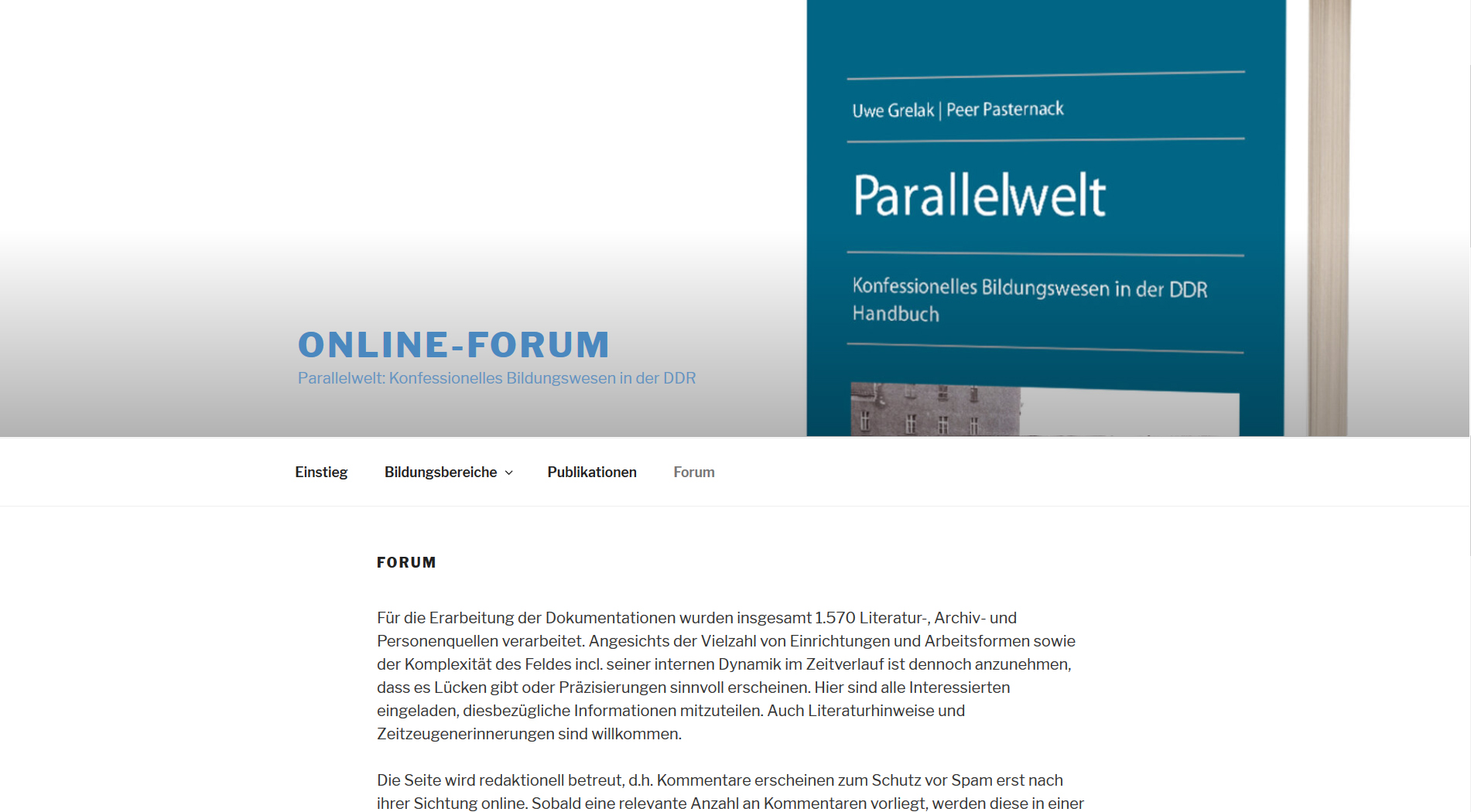 Im Dezember 2019 ist das Handbuch „Parallelwelt“ erschienen. Es dokumentiert das konfessionell gebundene Bildungswesen in der DDR. Dazu ist nun eine interaktive Website freigeschaltet worden. Sie richtet sich an Zeitzeugen und Historiker.innen, die in diesem Bereich arbeiten.