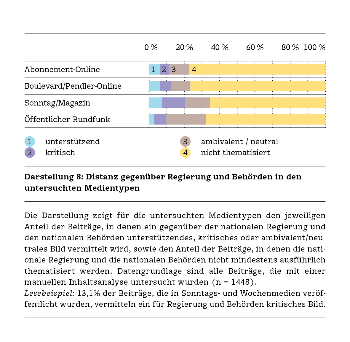 The study also found further differences between the types of media. Subscription-based media and public radio came out well, standing out with a particularly high variety of topics and experts, higher relevance and more context. Sunday papers or weekly publications and public radio maintained the greatest critical distance from authorities and government. Tabloid and daily media had less variety in their reporting and tended to simply report figures from the pandemic without placing them in context. They did not, however, resort to alarmist over-dramatic reporting of the threats.