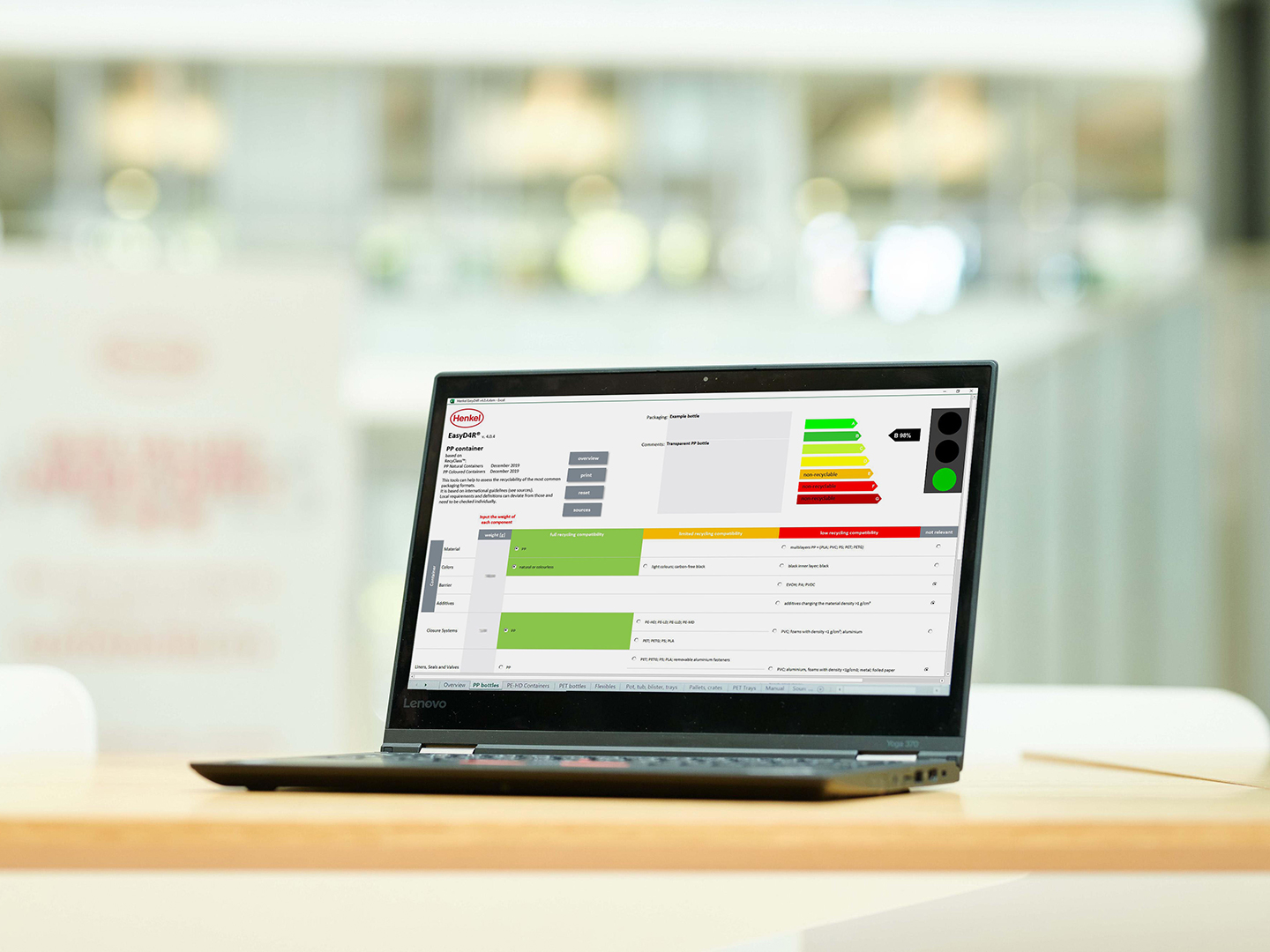 Henkel entwickelte Anfang 2019 ein einfach zu bedienendes Softwaretool um Kunststoffverpackungen während der Produktentwicklung auf ihre Recyclingfähigkeit zu überprüfen - auf Grundlage öffentlich anerkannter Kriterienkataloge. Es analysiert dabei die Zusammensetzung und die einzelnen Gewichtsanteile der Bestandteile – zum Beispiel Grundmaterialien, Verschlusssysteme, Etiketten oder Farben. Für alle Bestandteile ist die jeweilige Eignung für die Sortier- und Recyclingprozesse hinterlegt. Auf dieser Basis zeigt das Tool nach einem Ampelbewertungssystem ein klares Ergebnis an: Es veranschaulicht, welches Design zu welchem Prozentsatz recyclingfähig ist und wo Verbesserungspotenziale bestehen. So unterstützt es bei der Entwicklung nachhaltiger Verpackungslösungen. Das Tool steht auch anderen Unternehmen und Organisationen kostenlos auf der Website von Henkel zur Verfügung und wurde bereits über 2500 Mal heruntergeladen.