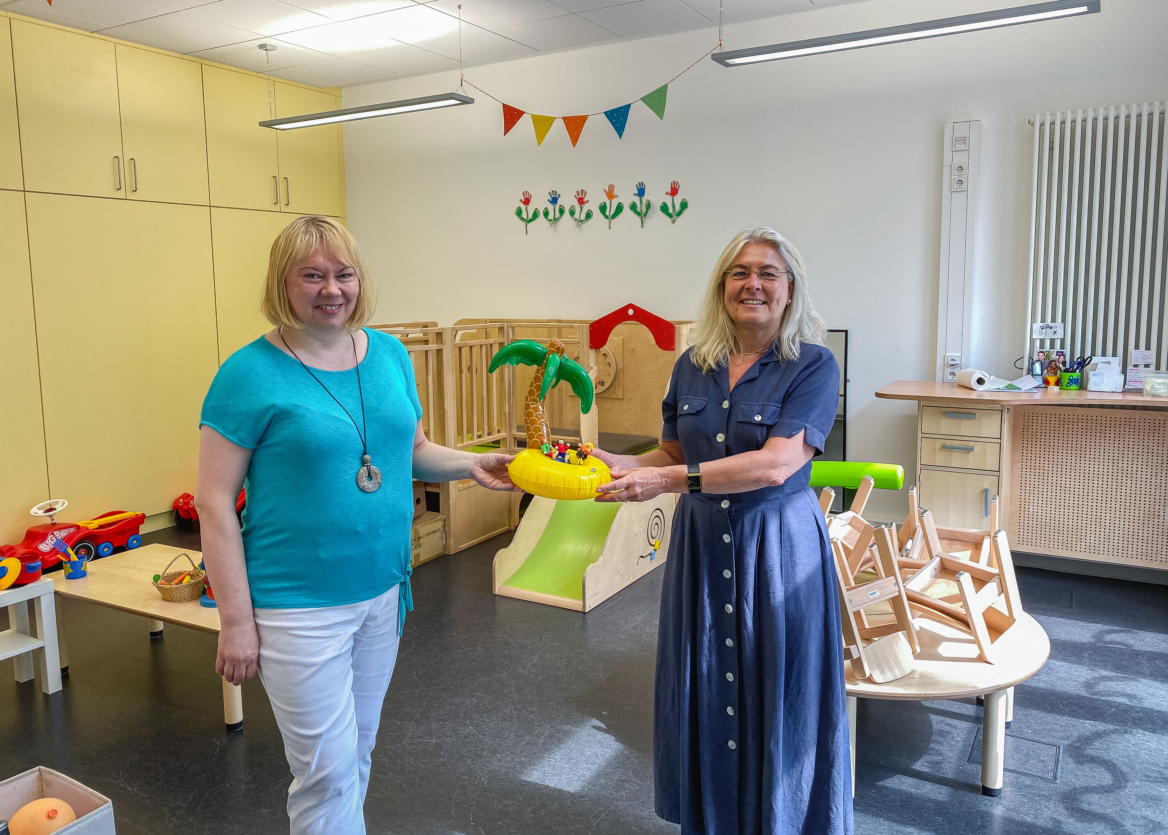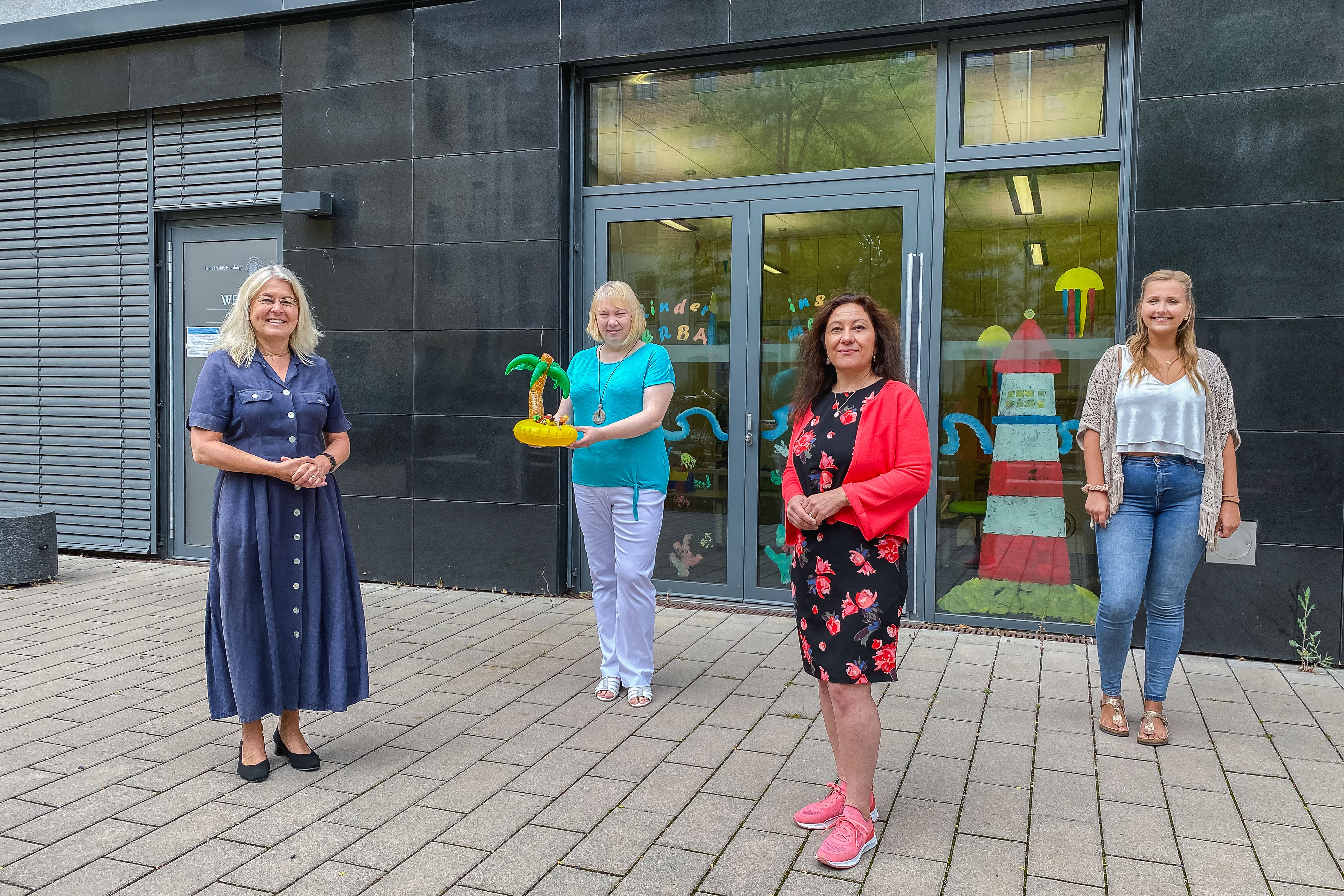 Mitarbeitende und Studierende der Universität Bamberg, die kleine Kinder haben, können sich freuen: Die Großtagespflegestelle „Kinderinsel ERBA.mbini“ bekommt ab 1. September 2020 einen neuen Träger – das Mehrgenerationenhaus Mütterzentrum Känguruh e.V. Das Diakonische Werk Bamberg-Forchheim e.V., das bislang Träger war, hat den Kooperationsvertrag mit der Universität Bamberg zum 31. August gekündigt. „Die Universität Bamberg hat alles darangesetzt, die Großtagespflegestelle weiterzuführen und das bestehende Angebot zu erhalten“, sagt Dr. Dagmar Steuer-Flieser, Kanzlerin der Universität. „Ich freue mich sehr, dass wir einen neuen Träger finden konnten und dadurch weiterhin Kinder von Universitätsmitgliedern auf der ERBA-Insel betreut werden können.“ Durch die Vermittlung des Oberbürgermeisters der Stadt Bamberg, Andreas Starke, ist es gelungen, den Verein Känguruh für die Trägerschaft zu gewinnen, die am Montag, 3. August, offiziell übergeben wurde.