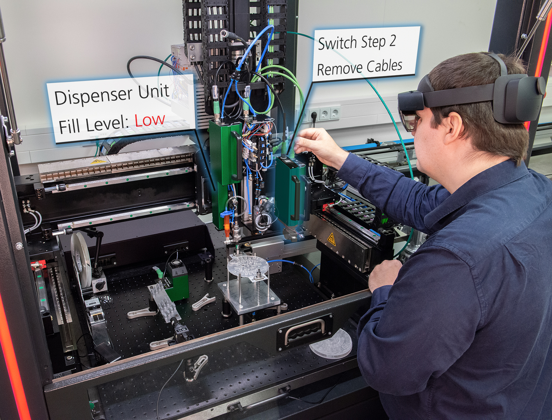 Während der Mitarbeiter die digitale Bedienanleitung im Sichtfeld seiner Datenbrille liest, behält er die Hände frei, um den Rüstvorgang einzuleiten, und den Blick auf die Maschine gerichtet. Für diese und andere Szenarien bietet Augmented Reality (AR) produzierenden Unternehmen und ihren Mitarbeitenden digitale Unterstützung. Durch die Einblendung von Textinformationen und Computergrafiken lassen sich Anwender in ihren Arbeitsprozessen unterstützen und auch über einen Remote Service von externen Spezialisten anleiten.