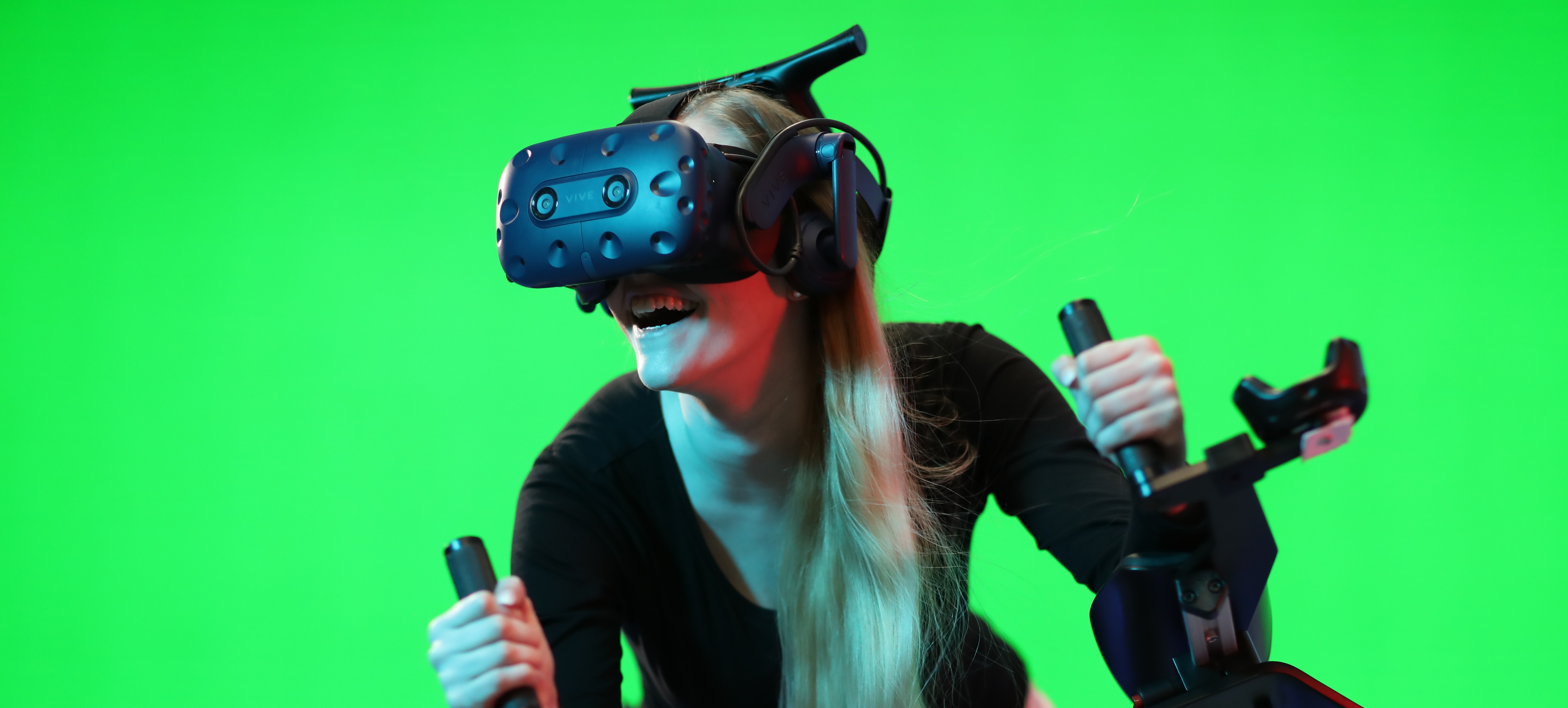 Das Foto zeigt Studentin Miriam Thüs auf dem ICAROS-Trainer. Über die 3D-Brille sieht sie Flugszenen aus der Vogel- bzw. Flugzeugperspektive. Auf dem als Fitnessgerät konzipierten Trainer muss sie sich körperlich aktiv an die Flugbewegungen anpassen. Foto:
