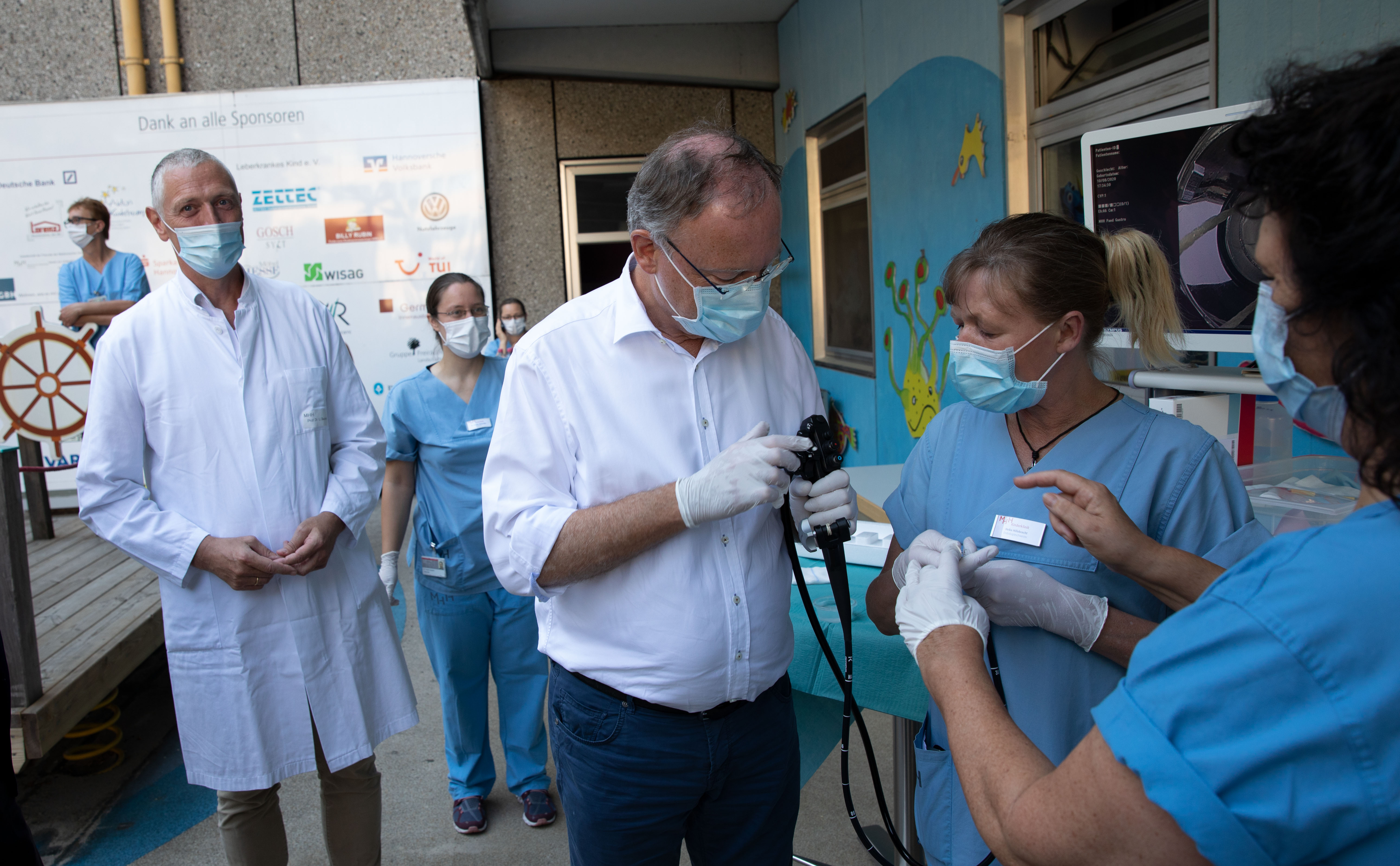 „Ich habe gerade einen kleinen Jungen besucht, der dank der hochentwickelten Forschung und Krankenversorgung der MHH weiterleben kann – das ist anrührend“, sagte Stephan Weil am Montag, 10. August 2020, bei seinem Besuch der Pädiatrischen Gastroenterologie und Hepatologie der Kinderklinik der Medizinischen Hochschule Hannover (MHH). Weil war nicht als Ministerpräsident, sondern in seiner Funktion als SPD-Landtagsabgeordneter in die MHH gekommen und besuchte nach eigenem Bekunden zum ersten Mal die Kinderklinik. „Ich danke Ihnen allen für die Leidenschaft, die dahinter steht.“