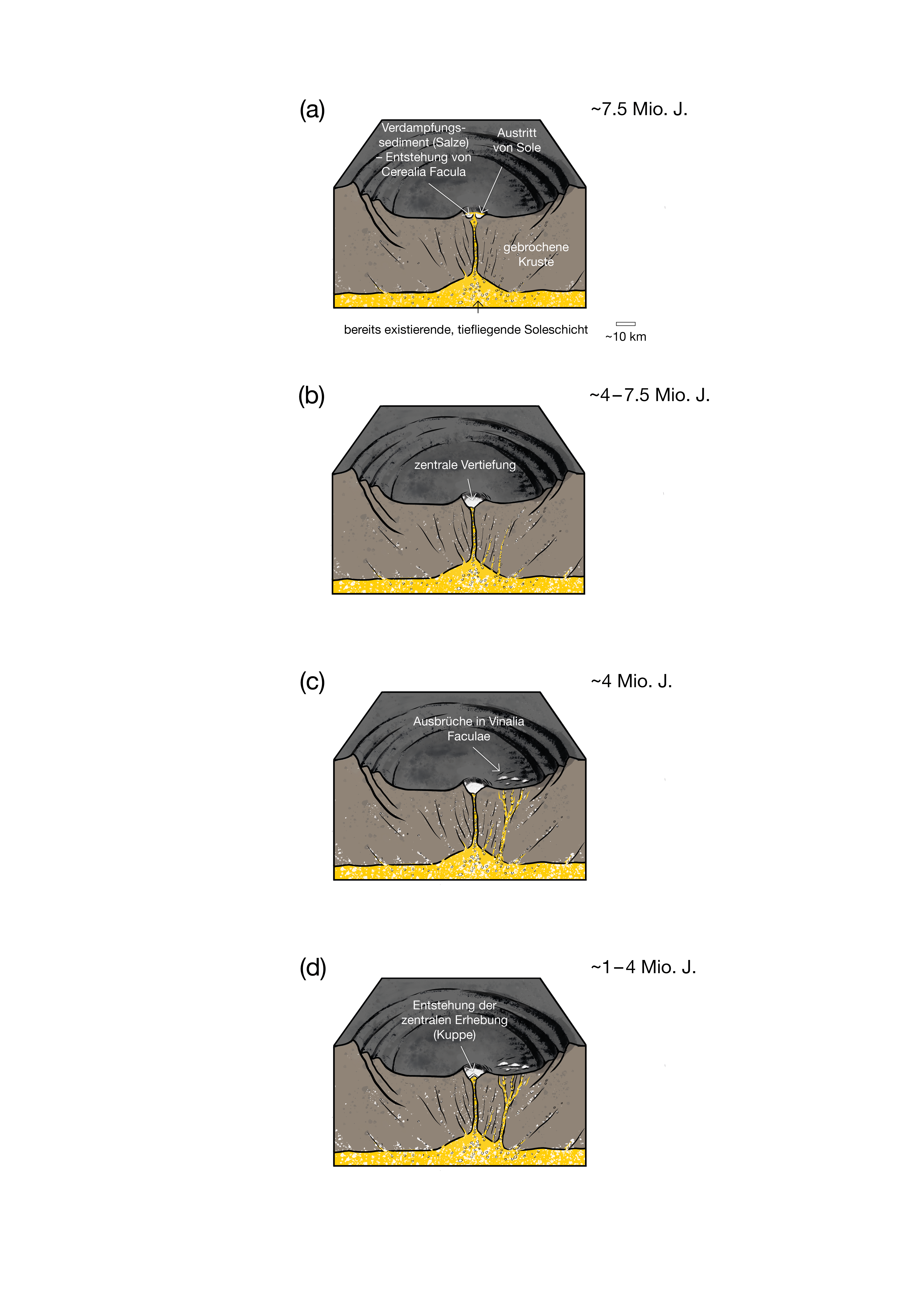 In den folgenden Jahrmillionen konzentrierte sich die Aktivität vor allem auf den östlichen Bereich des Kraterbodens. Durch Risse und Furchen quoll auch dort Sole an die Oberfläche und erzeugte weitere helle Ablagerungen, die Vinalia Faculae. Vor etwa 2 Millionen Jahren wachte das Zentrum des Kraters wieder auf: Erneut drang Sole an die Oberfläche, innerhalb der zentralen Vertiefung wölbte sich eine Kuppe aus hellem Material nach oben. „Dieser Prozess dürfte mindestens bis vor einer Million Jahre angedauert haben“, fasst Dr. Nico Schmedemann von der WWU die Ergebnisse zusammen.