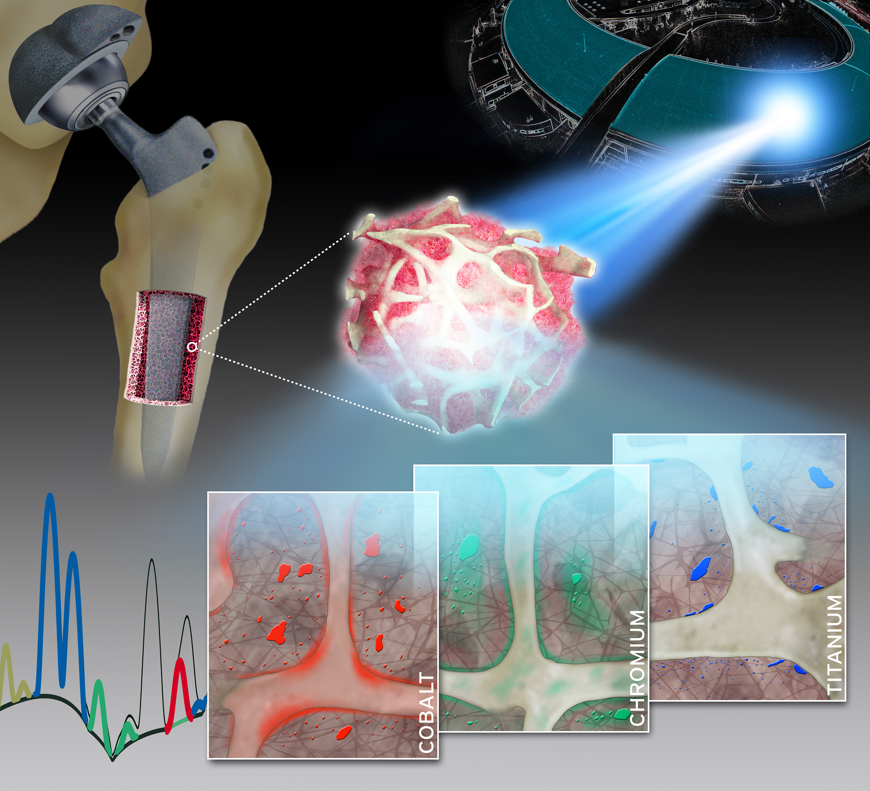 Die Forschenden untersuchten hierfür winzige Knochenproben von 14 Patienten, bei denen ein Hüft- oder Kniegelenk ersetzt werden musste. Sie nutzten hierfür die Röntgenfluoreszenzanalyse, um die elementare Zusammensetzung der Proben qualitativ und quantitativ zu bestimmen. Diese Technik gestattet einzigartige Einblicke hinsichtlich Konzentration, Verteilung, Lokalisierung und Anreicherung von metallischen Abbauprodukten wie Kobalt, Chrom oder Titan im angrenzenden Knochen und im Knochenmark. Die notwendige sehr reine und fokussierte Röntgenstrahlung hoher Intensität wurde durch die Synchrotronstrahlungsquelle des Teilchenbeschleunigers der European Synchrotron Radiation Facility (ESRF) im französischen Grenoble erreicht und erlaubt eine weltweit einmalige Ortsauflösung von bis zu 30 Nanometer. „Im Rahmen unserer Arbeit bringen wir also eine klinisch hochrelevante Fragestellung und einen hochkomplexen experimentellen Aufbau zusammen“, erklärt Dr. Janosch Schoon, Erstautor der Studie.