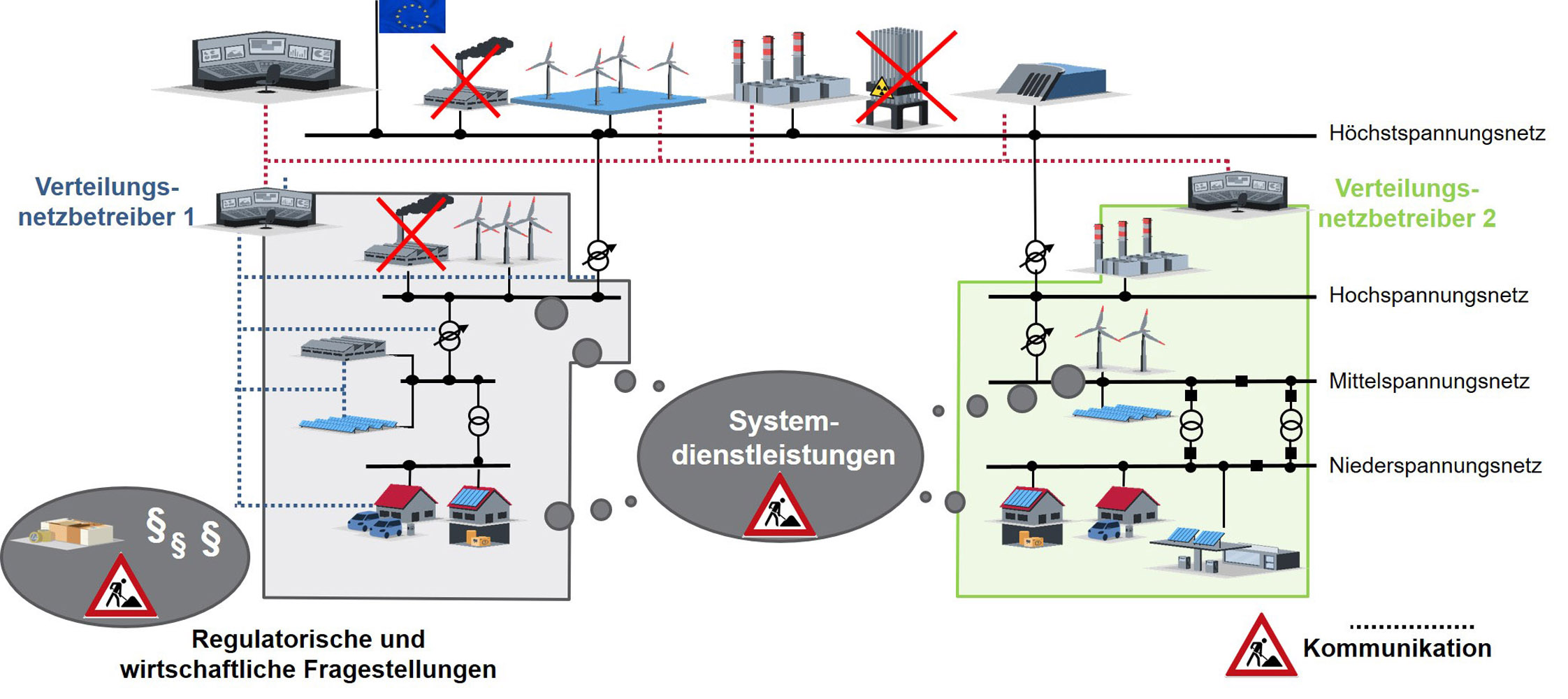 Aktuell wird ein Großteil der Systemdienstleistungen durch die Generatoren der fossilen Großkraftwerke bereitgestellt. Diese garantieren die Stabilität des Stromnetzes hinsichtlich Spannungs- und Frequenzhaltung, verhindern überregionale Überlastungen und bauen das Netz bei einem Zusammenbruch wieder auf. In der Übertragungsnetzebene koordinieren sich diese Kraftwerke und passen die elektrische Energieerzeugung stetig dem Bedarf an. Zukünftig müssen Erzeugungsanlagen auf Basis von erneuerbaren Energien und flexiblen Lasten in der Verteilnetzebene diese Aufgaben übernehmen. Diese Anlagen umfassen dabei eine Spanne von Offshore-Windparks in der Hochspannungsebene bis zu privaten Photovoltaik-Anlagen in der lokalen Niederspannungsebene. Aufgrund dieser Entwicklung wird die Stromerzeugung zunehmend dezentraler bei einer gleichzeitigen Zunahme der Erzeugungsanlagen. Um zukünftig Systemdienstleistungen sicherzustellen, müssen deutlich mehr Erzeuger und Verbraucher auf unterschiedlichen Ebenen koordiniert werden – eine Aufgabe, bei der die Digitalisierung der Energiesysteme in der Steuerung und Abrechnung eine entscheidende Rolle spielt. Hinzu kommen die Herausforderungen, die die fluktuierende Stromerzeugung bei Solar- und Windkraftwerken sowohl für die Flexibilität der Verbraucher als auch für das Stromnetz darstellen.