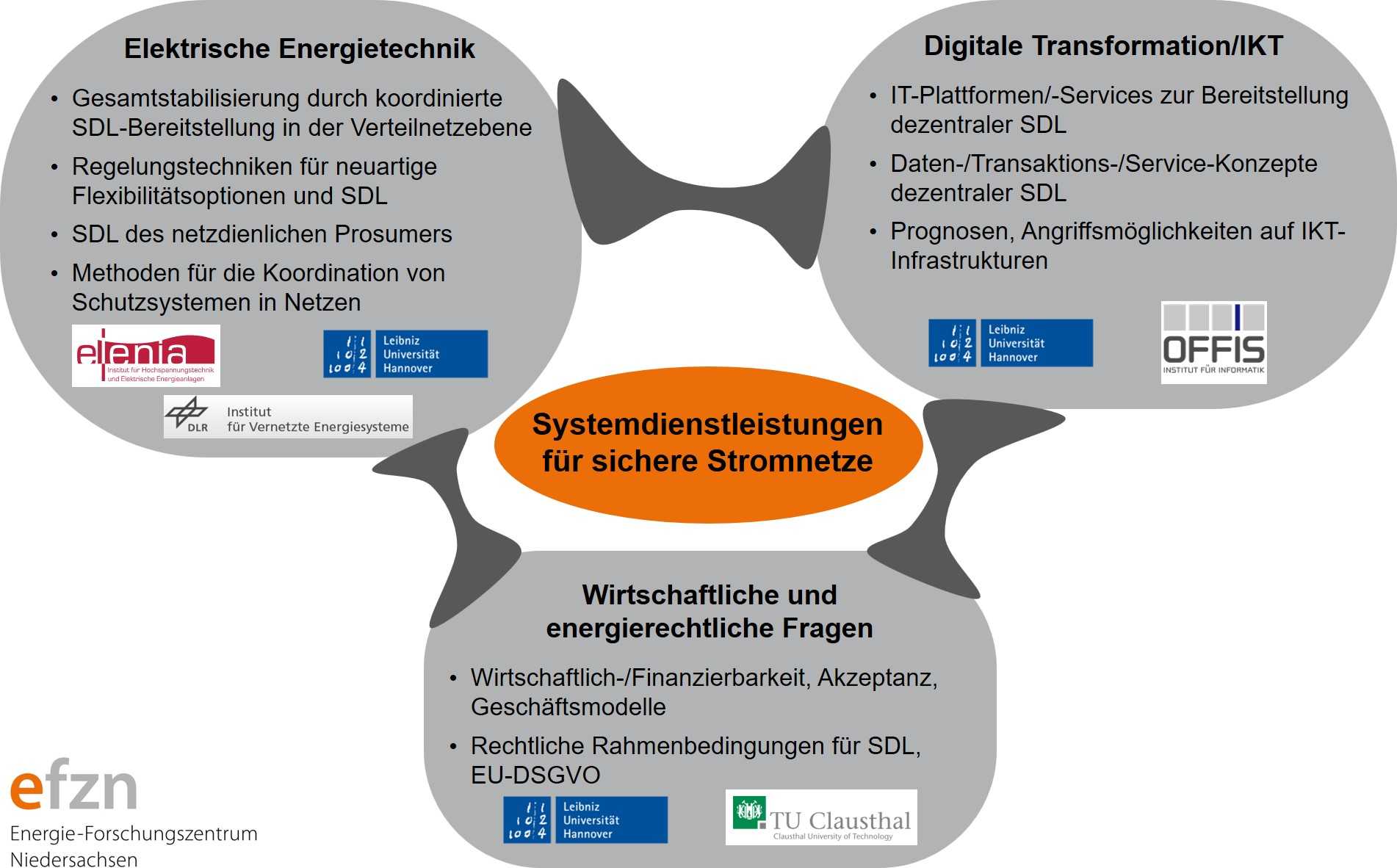 Vier Forschungsstandorte des EFZN mit Expertise in unterschiedlichen Bereichen arbeiten interdisziplinär und tief miteinander verzahnt an einem zukunftsfähigen Stromnetz. Das Projekt ist thematisch in drei Kompetenzbereiche gegliedert, die untereinander über Schnittstellen verfügen und jeweils von mehreren Projektpartnern bearbeitet werden.