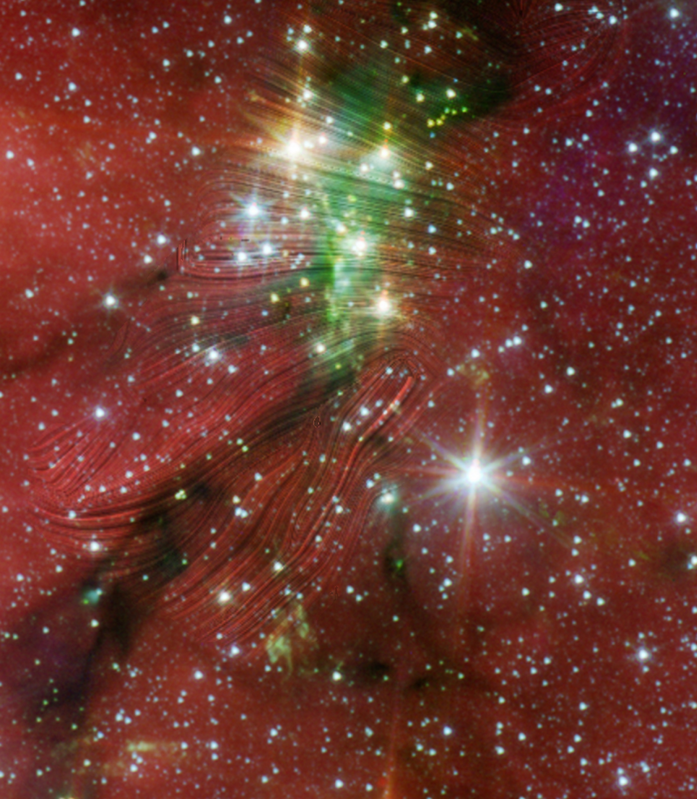 Die Beobachtung von Magnetfeldern in interstellaren Wolken deutet darauf hin, dass diese Wolken stark magnetisch sind und dass Magnetfelder die Sternentstehung beeinflussen. Die Ausrichtung der inneren Struktur dieser Wolken sollte somit eng mit der Magnetfeldausrichtung zusammenhängen. Die Filamentstruktur des dichten Gases in der Umgebung eines jungen Sternhaufens wurde mit dem HAWC+Empfänger an Bord von SOFIA im Infraroten untersucht. In einigen der Filamente passt sich das Magnetfeld dem Materiefluss an und orientiert sich entlang dessen Ausrichtung. Der von der Schwerkraft kommende magnetische Gasfluss wirkt wie ein Förderband für das Wachstum des zentralen jungen Sternhaufens.