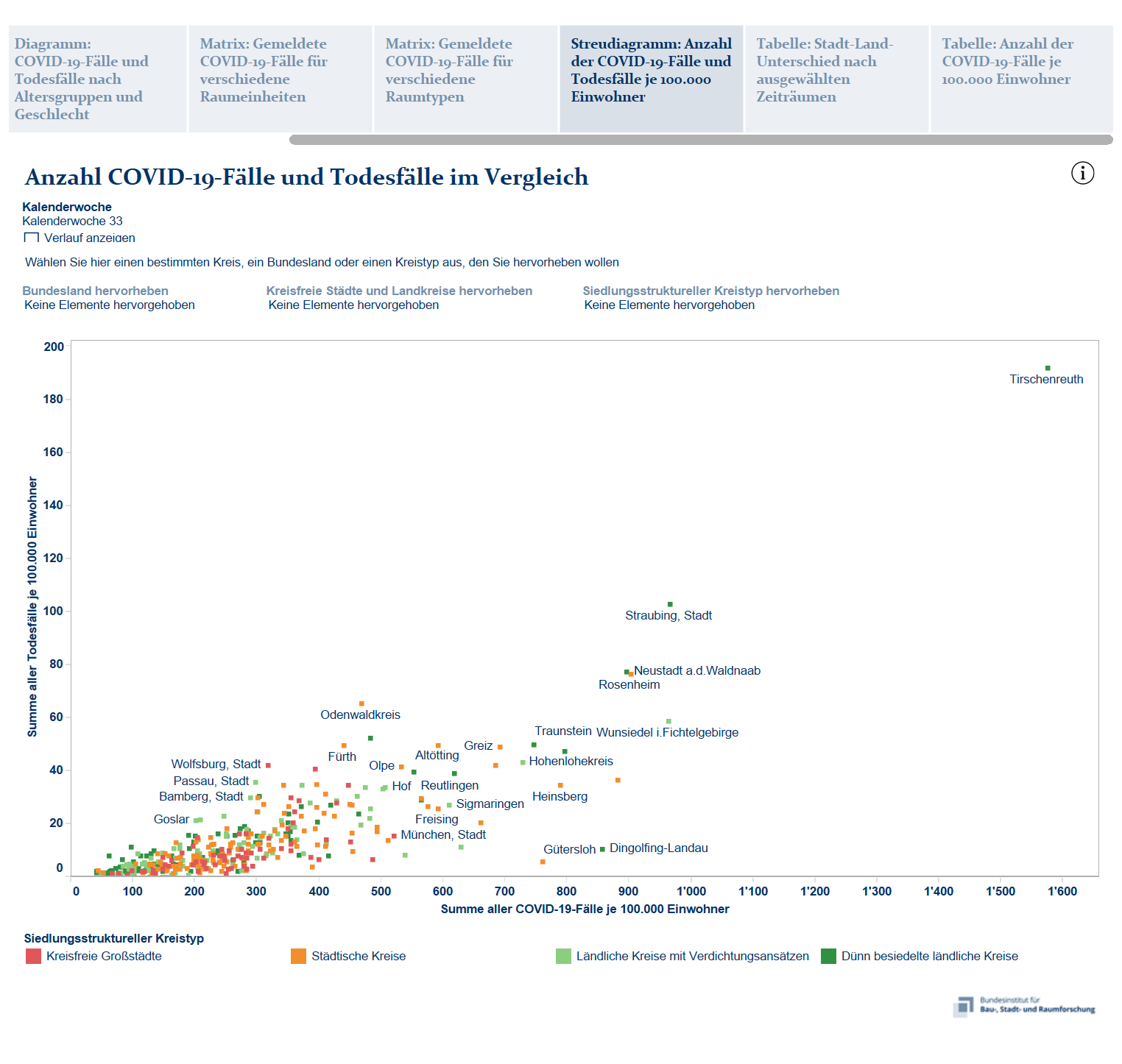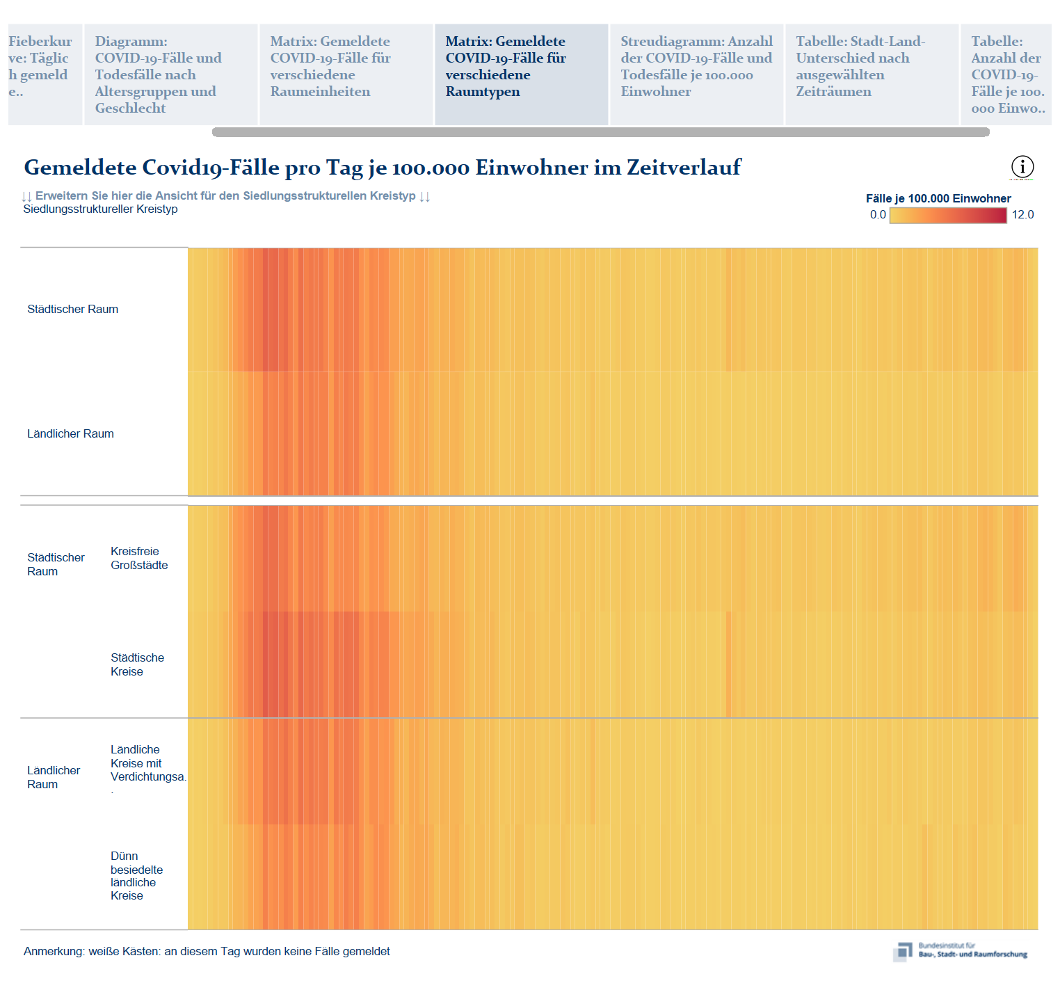 Die Anwendung ermöglicht es Interessierten, die Fallzahlen der Pandemie in für die Raumplanung wichtigen Zusammenhängen nachzuvollziehen, z.B. in städtischen und ländlichen Räumen, für administrative und siedlungsstrukturelle Einheiten wie Bundesländer und Landkreise oder für bestimmte Bevölkerungsindikatoren. Sie zeigt, welche Räume wie stark von der Pandemie betroffen waren und wie Hotspots die Fallzahlen einer Region beeinflussen. Kreis- und Streudiagramme, „Heatmaps“ (Entwicklung der Fallzahlen im Vergleich) und Liniendiagramme („Fieberkurven“) veranschaulichen die Entwicklung. Regionale Analysen sind auch für verschiedene Altersgruppen und differenziert nach Geschlechtern möglich.