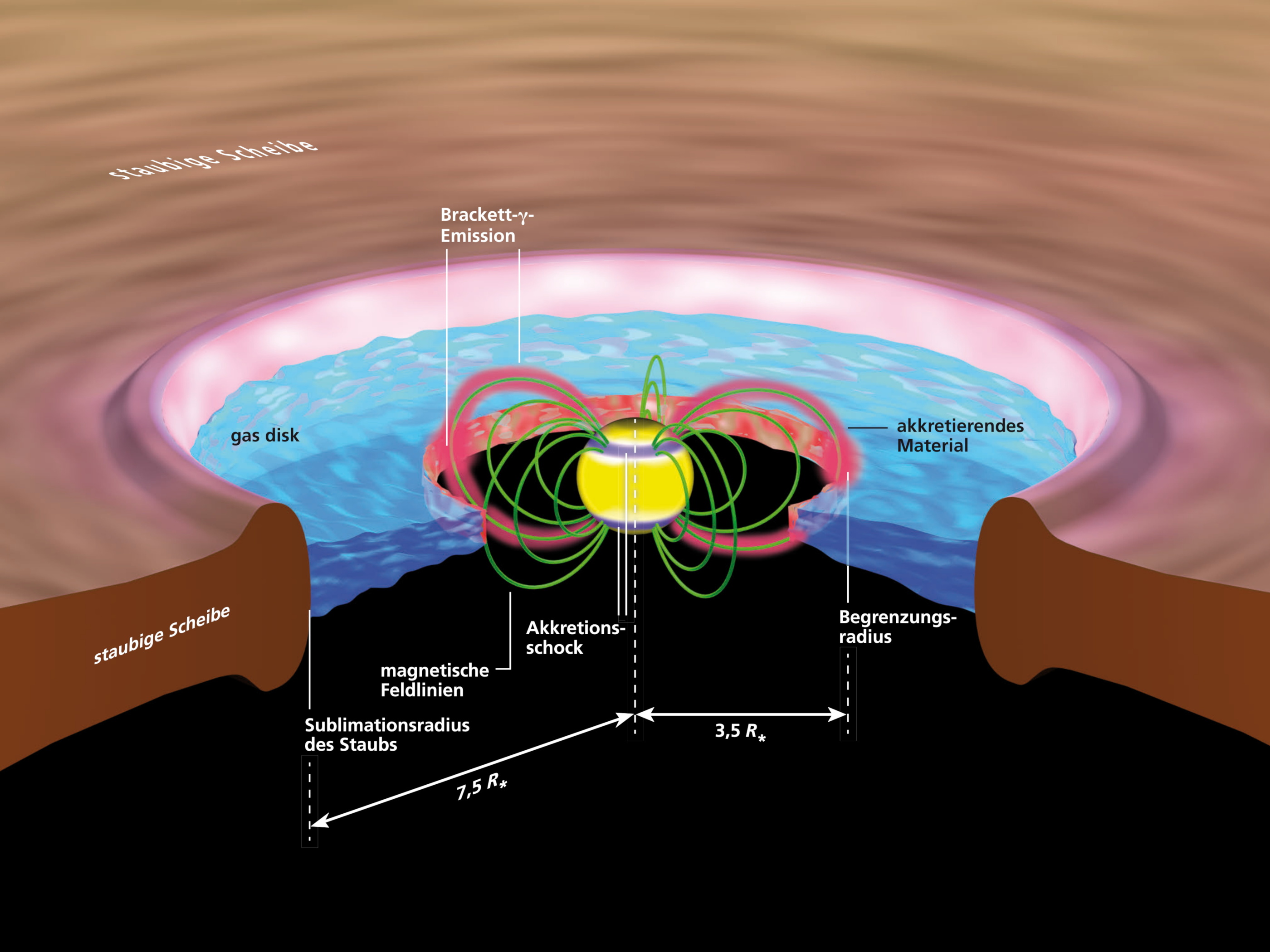 Diese Beobachtung ist äußerst aufschlussreich. Denn nach allem, was wir aus physikalischen Modellierungen solcher zirkumstellaren Scheiben wissen, können ihre inneren Ränder unmöglich so nahe an den Stern heranreichen. Erreicht uns Licht aus einer derart sternnahen Region, dann stammt es nicht aus der Scheibe. Auch auf einen Sternwind kann es bei dieser Entfernung nicht zurückzuführen sein, der von dem jungen stellaren Objekt weggeweht wird. Übrig bleibt als plausible Erklärung einzig das Modell der magnetosphärischen Akkretion.