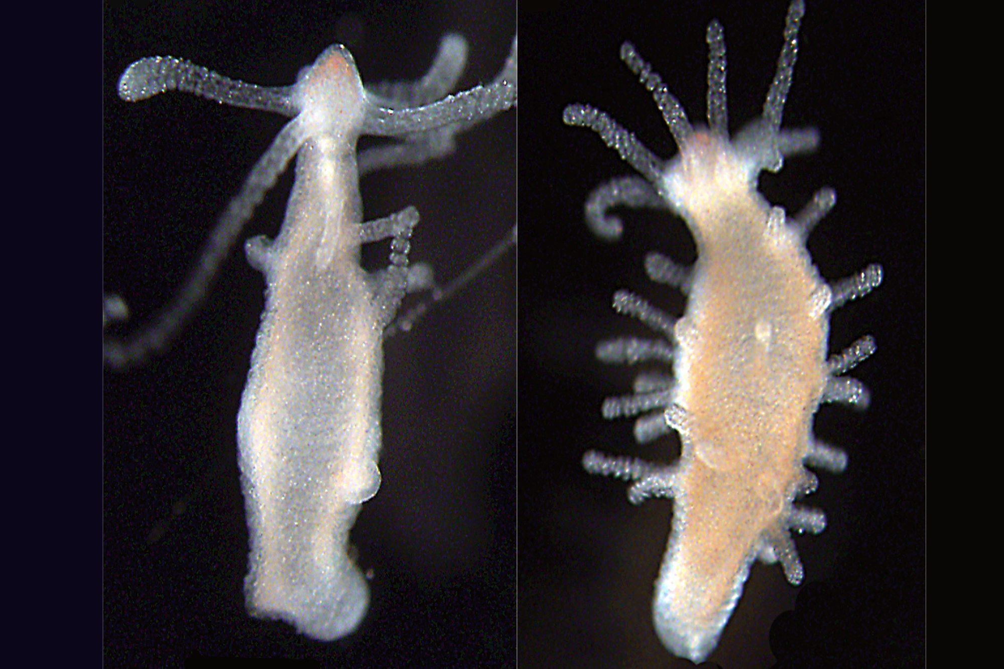 Bildunterschrift: Tiere mit einem normalem Mikrobiom (links) zeigen im Vergleich weniger Tentakeln als ihre keimfrei gemachten Artgenossen.